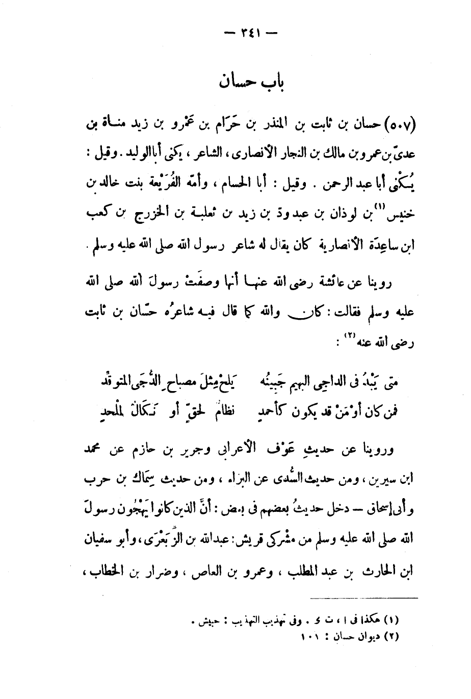 (٥٠٧) حسان بن ثابت بن المنذر بن حرام بن عمرو بن زيد مناة بن عدي بن عمرو بن مالك بن النجار الأنصاري،