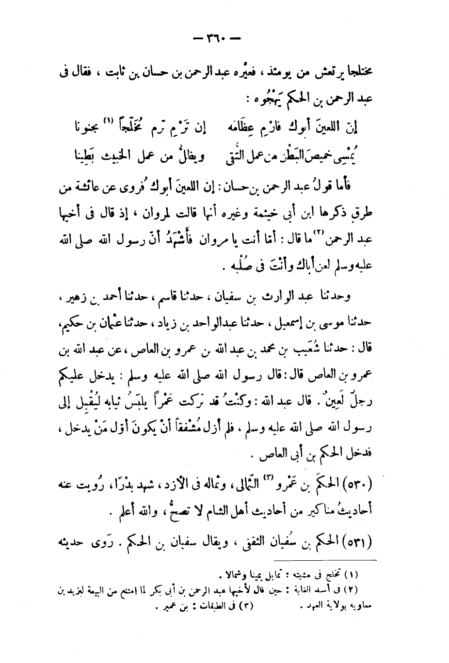 فأما قول عَبْد الرحمن بن حسان: إن اللعين أبوك فروى عن عائشة من طرق ذكرها ابن أبي خيثمة وغيره أنها قالت لمروان، إذ قَالَ في أخيها عَبْد الرحمن [٢] ما قَالَ: أما أنت يا مروان فأشهد أن رسول الله صلى الله عليه وسلم لعن أباك وأنت في صلبه.