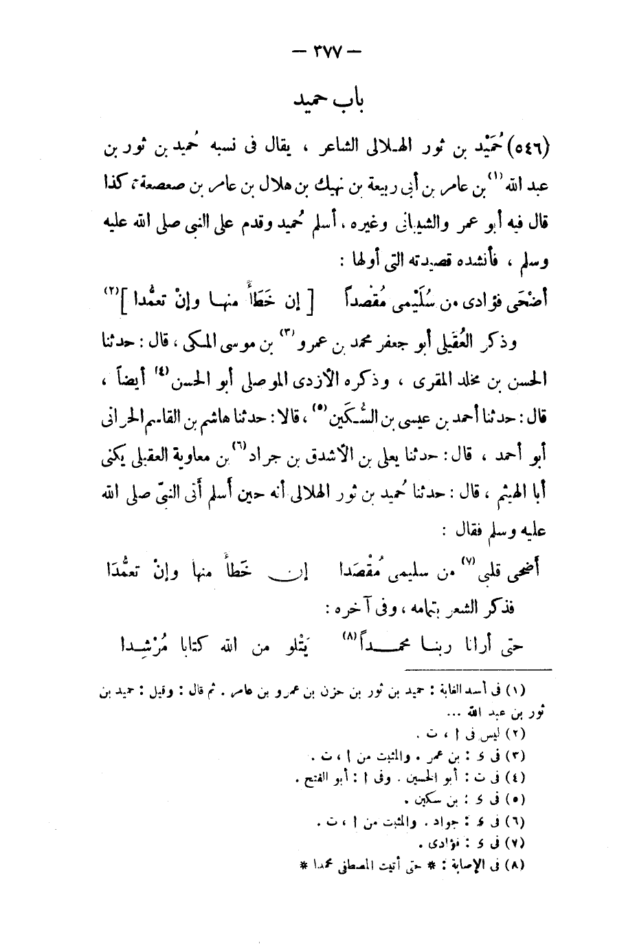 [١] في أسد الغابة: حميد بن ثور بن حزن بن عمرو بن عامر. ثم قال: وقيل: حميد بن ثور بن عبد الله ...