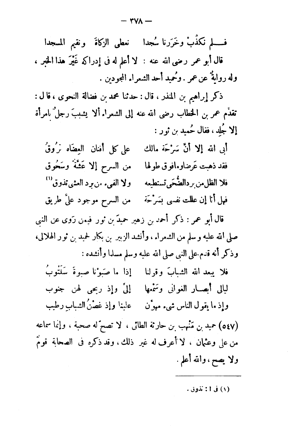 تقدم عمر بن الخطاب رضي الله عنه إلى الشعراء ألا يشبب رجل بامرأة إلا جلد، فقال حميد بن ثور: