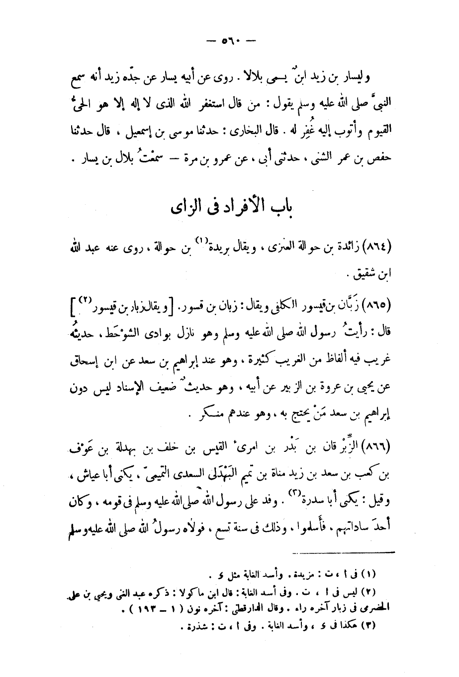 [٢] ليس في أ، ت. وفي أسد الغابة: قال ابن ماكولا: ذكره عبد الغنى ويحيى بن على الحضرميّ في زبار آخره راء. وقال الدار قطنى: آخره نون (١- ١٩٣) .