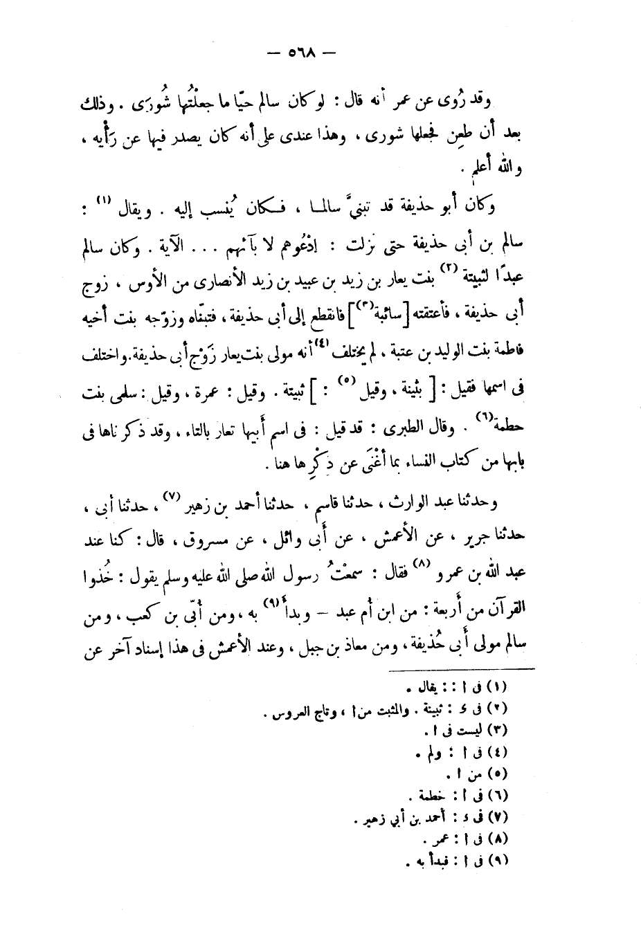 سالم بن أبى حذيفة حتى نزلت: ادْعُوهُمْ لِآبائِهِمْ ٣٣: ٥ ... الآية. وكان سالم عبدا لثبيتة [٢] بنت يعار بن زيد بن عبيد بن زيد الأنصاري من الأوس، زوج أبي حذيفة، فأعتقته [سائبة [٣]] فانقطع إلى أبي حذيفة، فتبناه وزوجه بنت أخيه فاطمة بنت الوليد بن عتبة، لم يختلف [٤] أنه مولى بنت يعار زوج أبي حذيفة. واختلف في اسمها فقيل: [بثينة، وقيل [٥] :] ثبيتة. وقيل: عمرة، وقيل: سلمى بنت حطمة [٦] . وَقَالَ الطبري: قد قيل: في اسم أبيها تعار بالتاء، وقد ذكرناها في بابها من كتاب النساء بما أغنى عن ذكرها هنا.