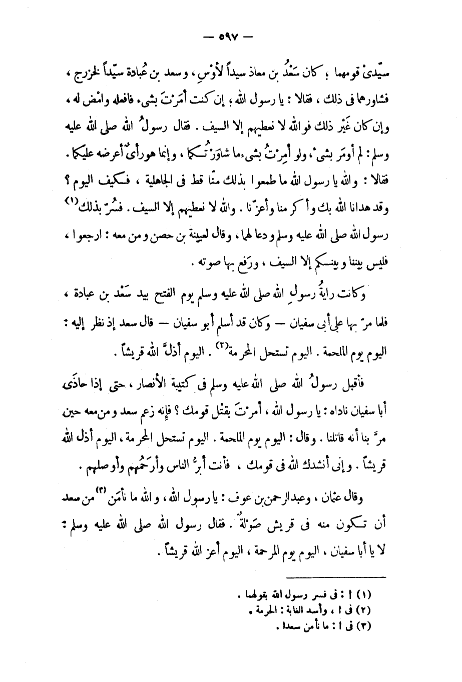وَقَالَ عثمان، وعبد الرحمن بن عوف: يا رَسُول اللَّهِ، والله ما نأمن [٣] من سعد أن تكون منه في قريش صولة. فَقَالَ رسول الله صلى الله عليه وسلم: لا يا أبا سفيان، اليوم يوم المرحمة، اليوم أعز الله قريشا.