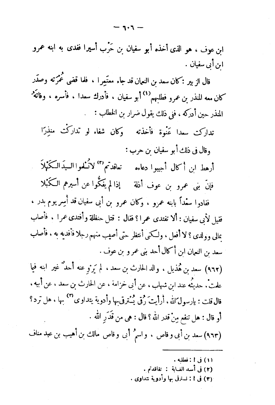 ففادوا سعدا بابنه عمرو، وكان عمرو بن أبي سفيان قد أسر يوم بدر، فقيل لأبي سفيان: ألا تفتدي عمرا؟ فَقَالَ: قتل حنظلة وأفتدي عمرا، فأصاب بمالي وولدي؟ لا أفعل، ولكني أنتظر حتى أصيب منهم رجلا فأفديه به، فأصاب سعد بن النعمان ابن أكال أحد بني عمرو بن عوف.