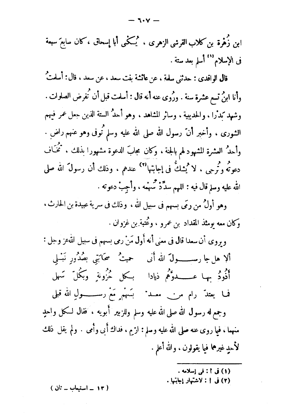 وَأَحَدُ الْعَشَرَةِ الْمَشْهُودُ لَهُمْ بِالْجَنَّةِ، وَكَانَ مُجَابَ الدَّعْوَةِ مَشْهُورًا بِذَلِكَ، تُخَافُ دَعْوَتُهُ وَتُرْجَى، لا يُشَكُّ فِي إِجَابَتِهَا [٢] عِنْدَهُمْ، وَذَلِكَ أَنَّ رَسُولَ اللَّهِ صَلَّى اللَّهُ عَلَيْهِ وَسَلَّمَ قَالَ فِيهِ: اللَّهمّ سَدِّدْ سَهْمَهُ، وَأَجِبْ دَعْوَتَهُ. وهو أول من رمى بسهم في سبيل الله، وذلك في سرية عبيدة بن الحارث، وكان معه يومئذ المقداد بن عمرو، وعتبة بن غزوان.