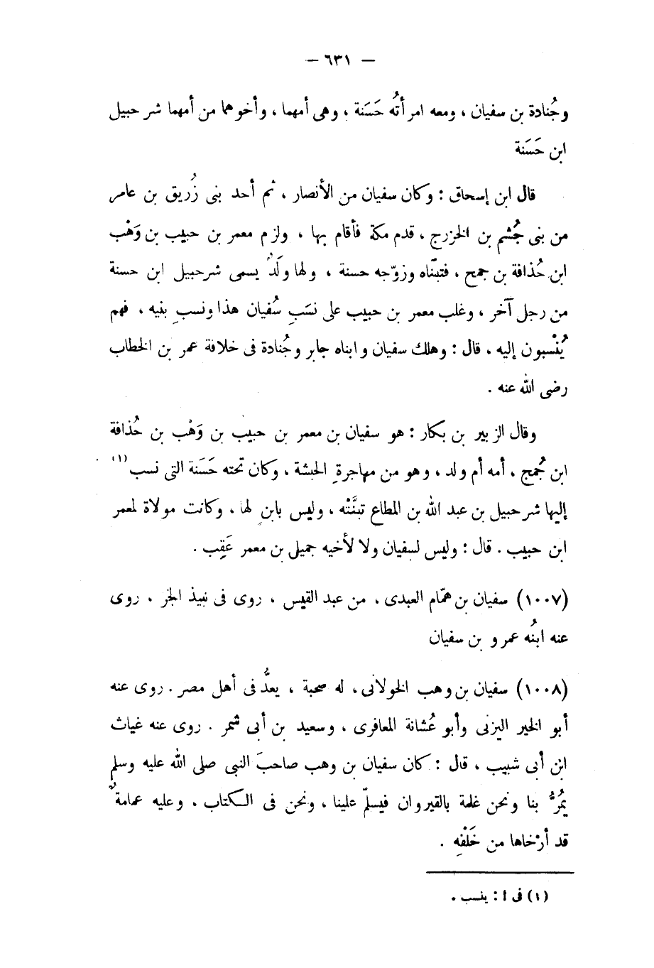 وجنادة بن سفيان، ومعه امرأته حسنة، وهي أمهما، وأخوهما من أمهما شرحبيل ابن حسنة قَالَ ابن إسحاق: وكان سفيان من الأنصار، ثم أحد بني زريق بن عامر من بني جشم بن الخزرج، قدم مكة فأقام بها، ولزم معمر بن حبيب بن وهب ابن حذافة بن جمح، فتبناه وزوجه حسنة، ولها ولد يسمى شرحبيل ابن حسنة من رجل آخر، وغلب معمر بن حبيب على نسب سفيان هذا ونسب بنيه، فهم ينسبون إليه، قَالَ: وهلك سفيان وابناه جابر وجنادة في خلافة عمر بن الخطاب رضي الله عنه.