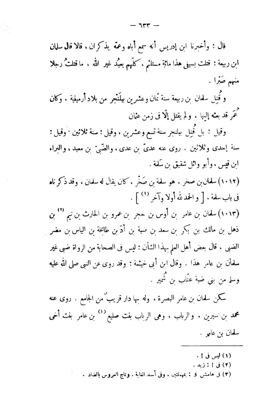 (١٠١٣) سلمان بن عامر بن أوس بن حجر بن عمرو بن الحارث بن تيم [٢] بن ذهل بن مالك بن بكر بن سعد بن ضبة بن أد بن طابخة بن إلياس بن مضر الضبي،