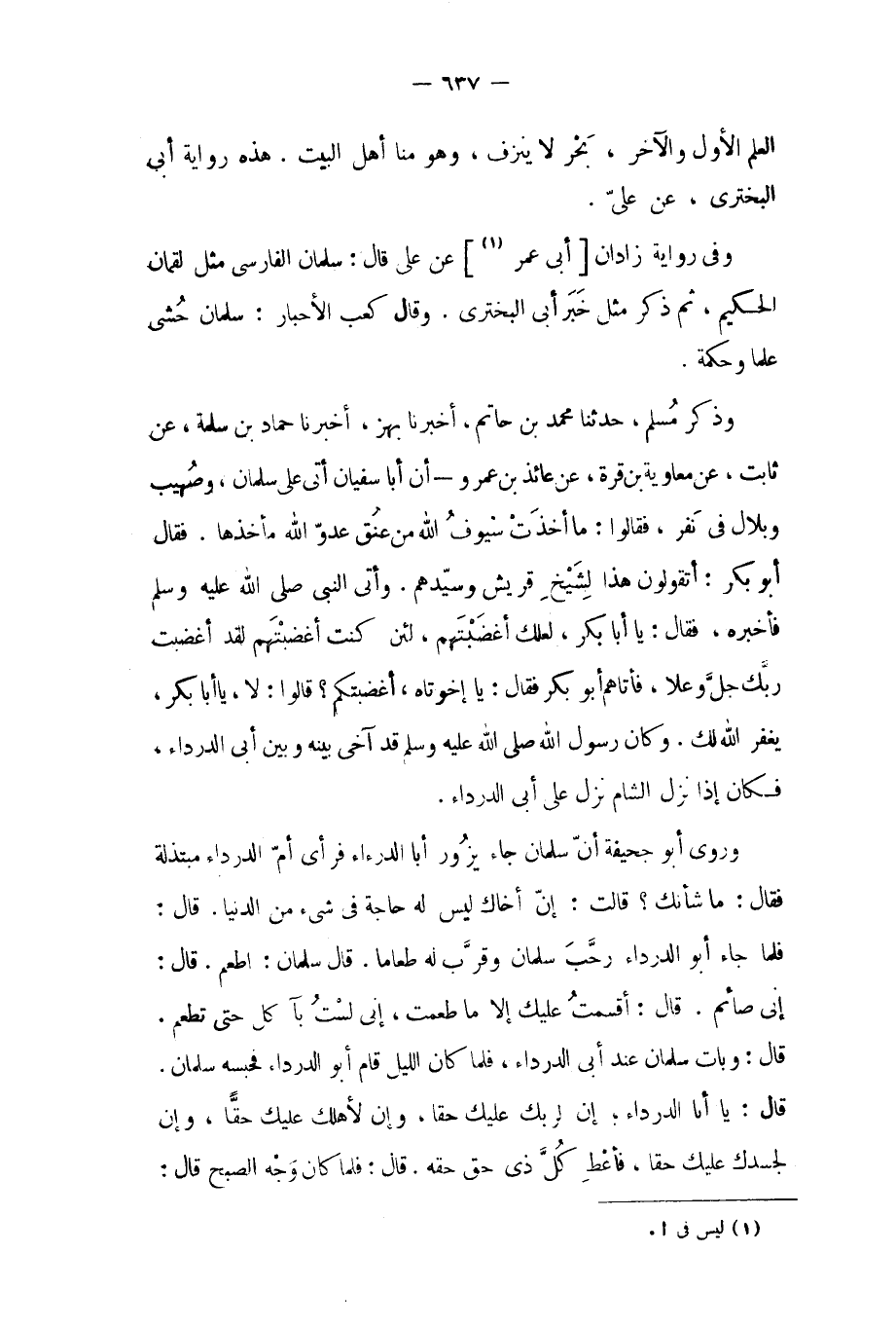 وَفِي رِوَايَةِ زَادَانَ [أَبِي عُمَرَ [١]] عَنْ عَلِيٍّ قَالَ: سَلْمَانُ الْفَارِسِيُّ مِثْلُ لُقْمَانَ الْحَكِيمِ، ثُمَّ ذَكَرَ مِثْلَ خَبَرِ أَبِي الْبَخْتَرِيِّ. وَقَالَ كَعْبُ الأَحْبَارِ: سَلْمَانُ حُشِيَ عِلْمًا وَحِكْمَةً.