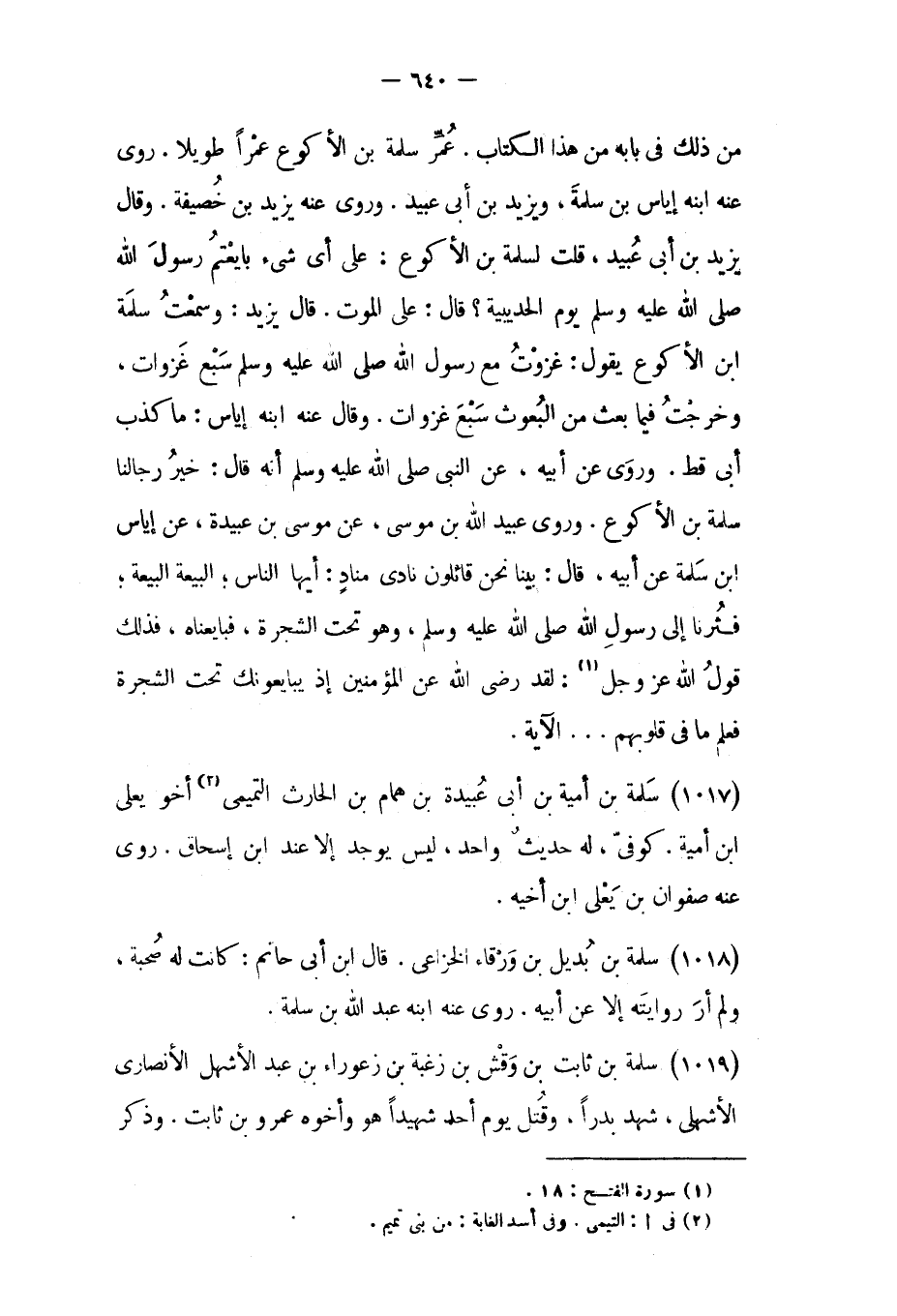 من ذَلِكَ في بابه من هذا الكتاب. عمر سلمة بن الأكوع عمرا طويلا. روى عنه ابنه إياس بن سلمة، ويزيد بن أبي عبيد. وروى عنه يزيد بن خصيفة. وَقَالَ يزيد بن أبي عبيد، قلت لسلمة بن الأكوع: على أي شيء بايعتم رَسُول اللَّهِ صَلَّى اللَّهُ عَلَيْهِ وَسَلَّمَ يوم الحديبية؟ قَالَ: على الموت. قَالَ يزيد: وسمعت سلمة ابن الأكوع يقول: غزوت مع رَسُول اللَّهِ صَلَّى اللَّهُ عَلَيْهِ وَسَلَّمَ سبع غزوات، وخرجت فيما بعث من البعوث سبع غزوات. وَقَالَ عنه ابنه إياس: ما كذب أبي قط. وروى عن أبيه، عن النبي صلى الله عليه وَسَلَّمَ أنه قَالَ: خير رجالنا سلمة بن الأكوع. وَرَوَى عُبَيْدُ اللَّهِ بْنُ مُوسَى، عَنْ موسى بن عبيدة، عن إياس ابن سَلَمَةَ عَنْ أَبِيهِ، قَالَ: بَيَّنَا نَحْنُ قَائِلُونَ نَادَى مُنَادٍ: أَيُّهَا النَّاسُ، الْبَيْعَةَ الْبَيْعَةَ، فَثُرْنَا إلى رسول الله صلى الله عليه وسلم، وَهُوَ تَحْتَ الشَّجَرَةِ، فَبَايَعْنَاهُ، فَذَلِكَ قَوْلُ اللَّهِ عَزَّ وَجَلَّ [١] : لَقَدْ رَضِيَ اللَّهُ عَنِ الْمُؤْمِنِينَ إِذْ يُبايِعُونَكَ تَحْتَ الشَّجَرَةِ فَعَلِمَ مَا فِي قُلُوبِهِمْ.. ٤٨: ١٨. الآية.