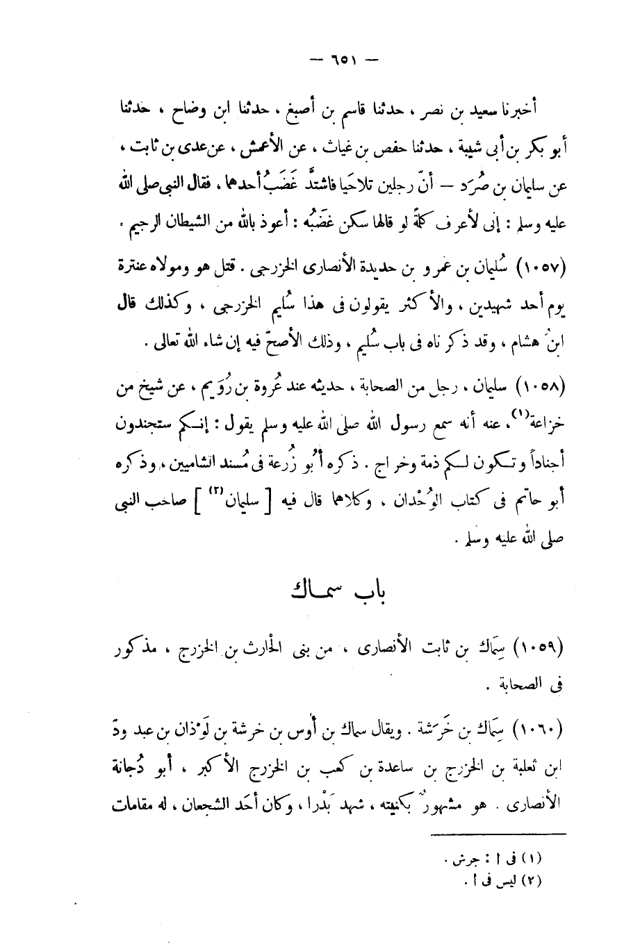 أَخْبَرَنَا سَعِيدُ بْنُ نَصْرٍ، حَدَّثَنَا قَاسِمُ بْنُ أصبغ، حدثنا ابن وضاح، حدثنا أبو بكر بْنُ أَبِي شَيْبَةَ، حَدَّثَنَا حَفْصُ بْنُ غِيَاثٍ، عَنِ الأَعْمَشِ، عَنْ عَدِيِّ بْنِ ثَابِتٍ، عَنْ سُلَيْمَانَ بْنِ صُرَدٍ- أَنَّ رَجُلَيْنِ تَلاحَيَا فَاشْتَدَّ غَضَبُ أَحَدُهُمَا، فَقَالَ النَّبِيُّ صَلَّى اللَّهُ عَلَيْهِ وَسَلَّمَ: إِنِّي لأَعْرِفُ كَلِمَةً لَوْ قَالَهَا سَكَنَ غَضَبُهُ: أَعُوذُ باللَّه مِنَ الشَّيْطَانِ الرَّجِيمِ،