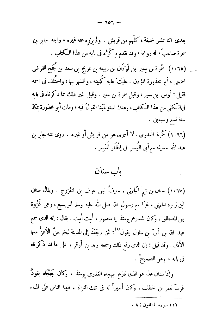 حليف لبني عوف بن الخزرج. ويقَالَ سنان ابن وبرة الجهني، غزا مع رَسُول اللَّهِ صَلَّى اللَّهُ عَلَيْهِ وَسَلَّمَ المريسيع، وهي غزوة بني المصطلق، وكان شعارهم يومئذ يا منصور، أمت أمت. يقَالَ: إنه الذي سمع عبد الله بن أبي بن سلول يقول [١] : لَئِنْ رَجَعْنا إِلَى الْمَدِينَةِ لَيُخْرِجَنَّ الْأَعَزُّ مِنْهَا الْأَذَلَّ ٦٣: ٨. وقد قيل: إن الذي رفع ذَلِكَ وسمعه زيد بن أرقم، على ما قد ذكرناه في بابه، وهو الصحيح.