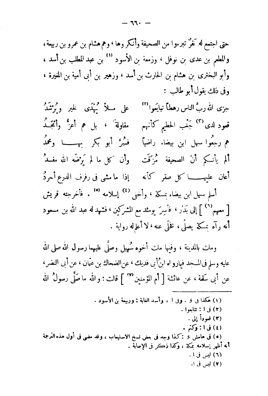 حتى اجتمع له نفر تبرءوا من الصحيفة وأنكروها، وهم هشام بن عمرو بن ربيعة، والمطعم بن عدي بن نوفل، وزمعة بن الأسود [١] بن عبد المطلب بن أسد، وأبو البختري بن هشام بن الحارث بن أسد، وزهير بن أبي أمية بن المغيرة، وفي ذلك يقول أبو طالب: