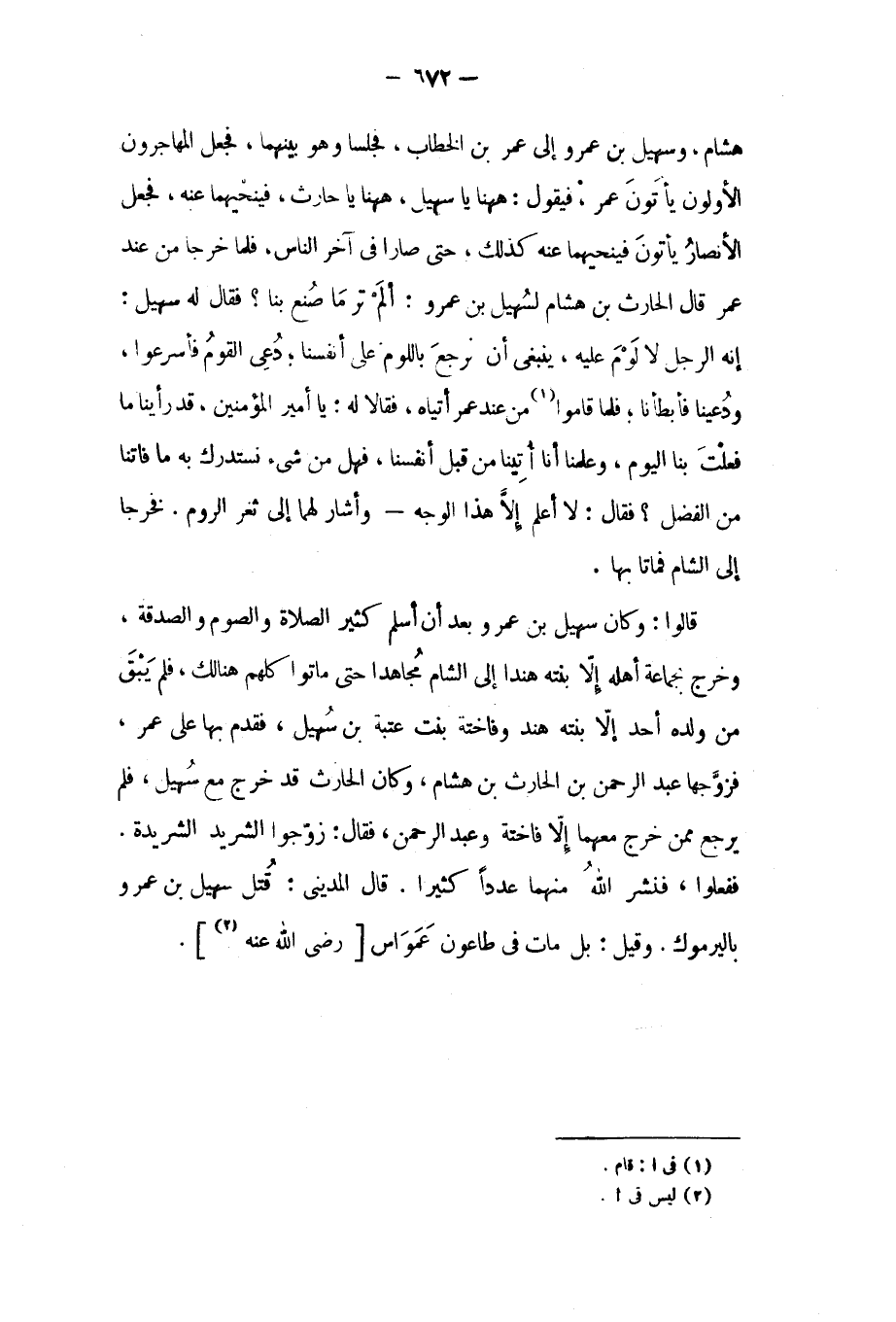 هشام، وسهيل بن عمرو إلى عمر بن الخطاب، فجلسا وهو بينهما، فجعل المهاجرون الأولون يأتون عمر، فيقول: هاهنا يا سهيل، هاهنا يا حارث، فينحيهما عنه، فجعل الأنصار يأتون فينحيهما عنه كذلك، حتى صارا في آخر الناس، فلما خرجا من عند عمر قَالَ الحارث بن هشام لسهيل بن عمرو: ألم تر ما صنع بنا؟ فَقَالَ له سهيل: