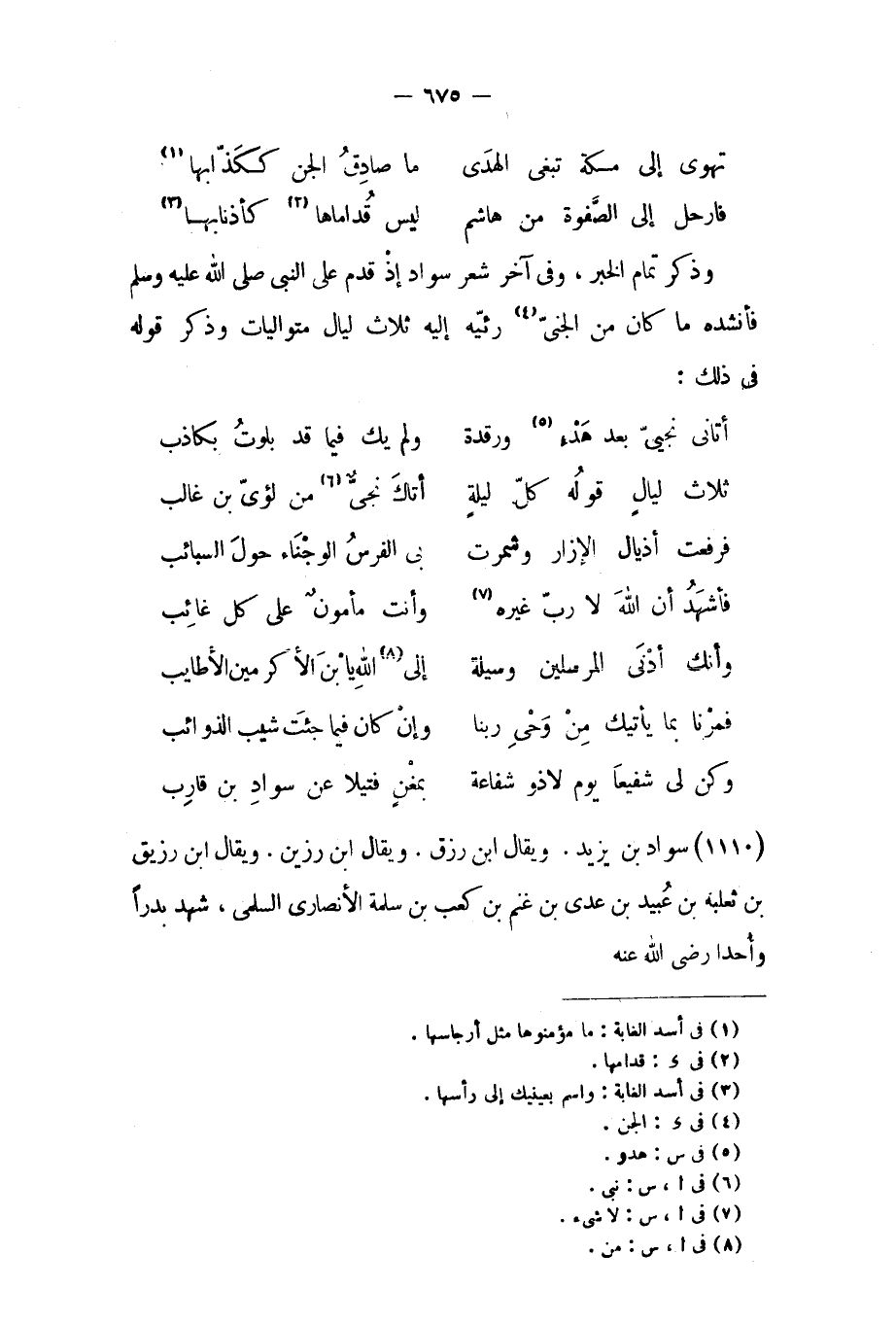 وذكر تمام الخبر، وفي آخر شعر سواد إذ قدم على النبي صَلَّى اللَّهُ عَلَيْهِ وَسَلَّمَ فأنشده ما كان من الجني [٤] رئيه إليه ثلاث ليال متواليات وذكر قوله في ذلك: