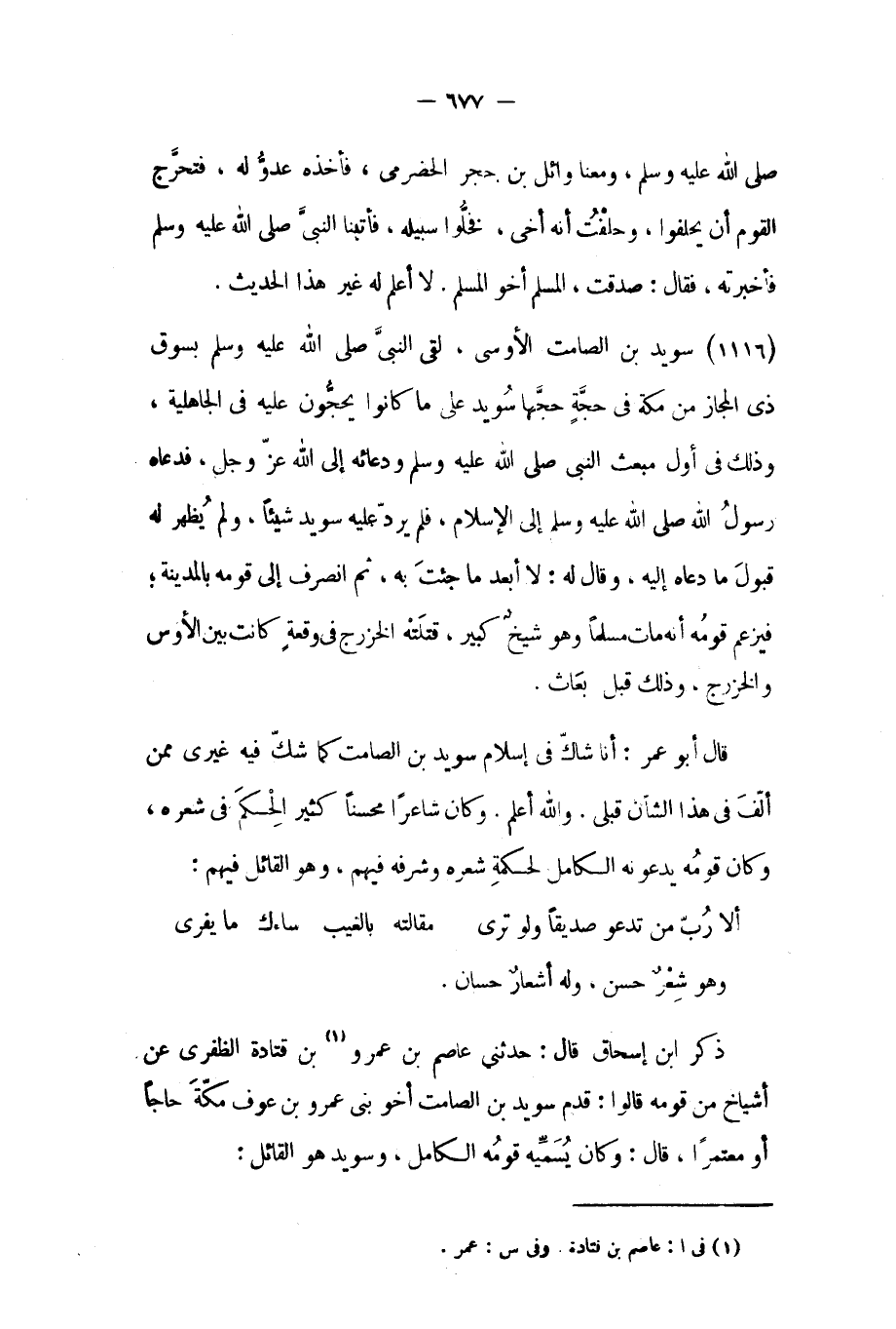 ذكر ابن إسحاق قَالَ: حَدَّثَنِي عاصم بن عمرو [١] بن قتادة الظفري عن أشياخ من قومه قالوا: قدم سويد بن الصامت أخو بني عمرو بن عوف مكة حاجا أو معتمرا، قَالَ: وكان يسمّيه قومه الكامل، وسويد هو القائل: