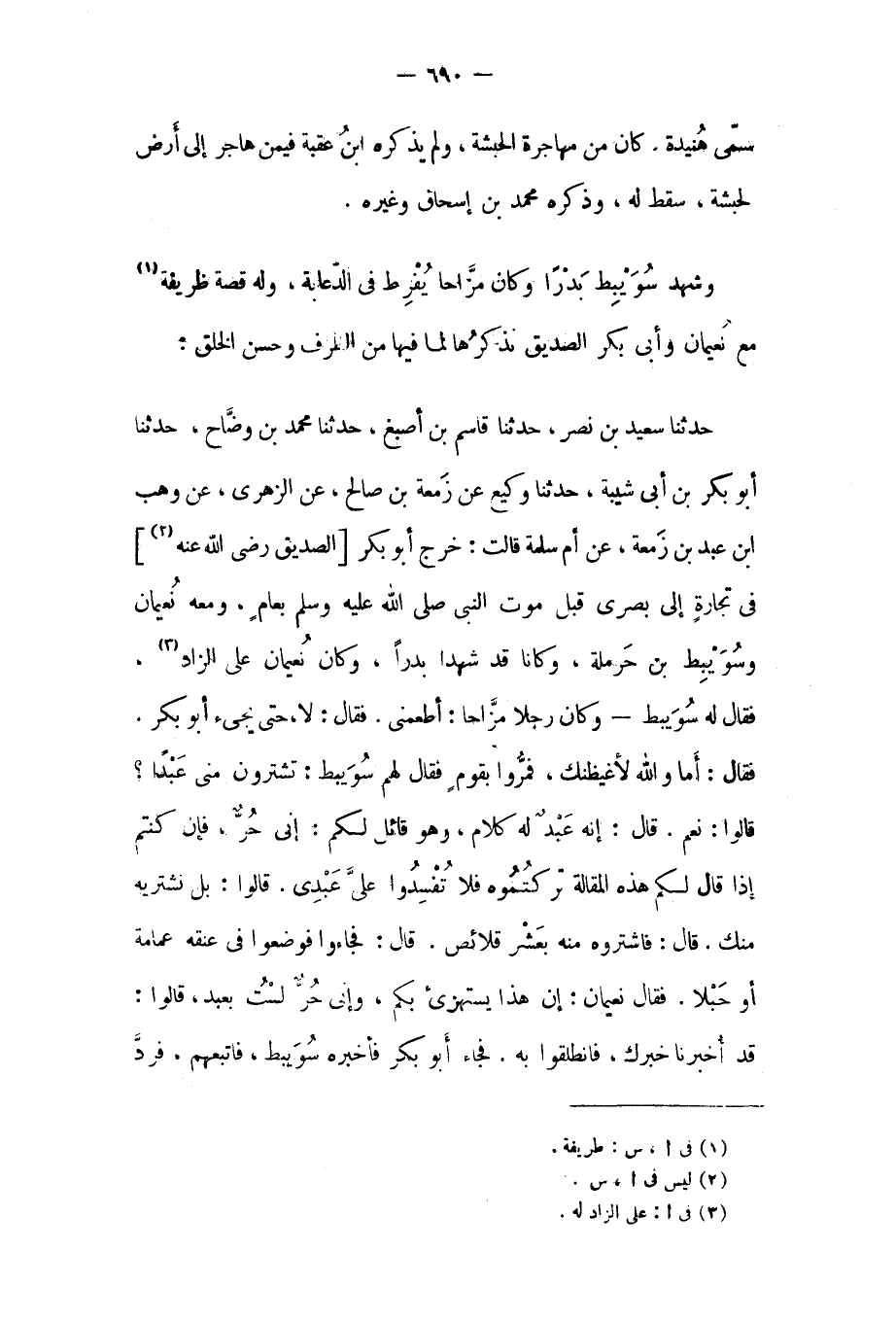 حَدَّثَنَا سَعِيدُ بْنُ نَصْرٍ، حَدَّثَنَا قَاسِمُ بْنُ أَصْبَغَ، حَدَّثَنَا مُحَمَّدُ بْنُ وَضَّاحٍ، حدثنا أبو بكر بن أبي شيبة، حدثنا وكيع عن زمعة بن صالح، عن الزهري، عن وهب ابن عبد بن زمعة، عن أم سلمة قالت: خرج أبو بكر [الصديق رضي الله عنه [٢]] في تجارة إلى بصرى قبل موت النبي صَلَّى اللَّهُ عَلَيْهِ وَسَلَّمَ بعام، ومعه نعيمان وسويبط بن حرملة، وكانا قد شهدا بدرا، وكان نعيمان على الزاد [٣] ، فَقَالَ له سويبط- وكان رجلا مزاحا: أطعمني. فَقَالَ: لا، حتى يجيء أبو بكر.