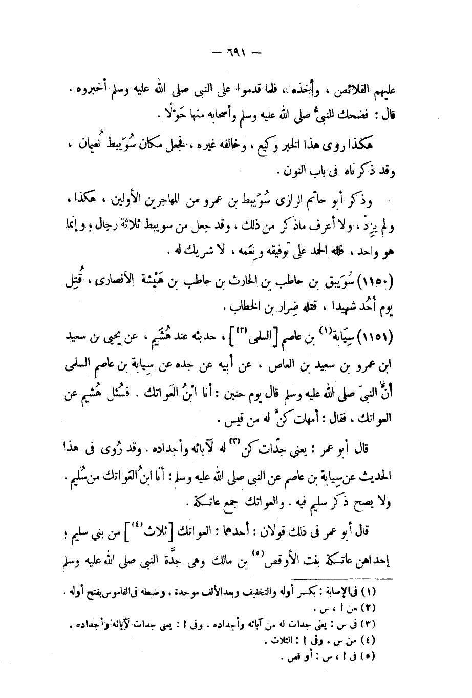 ، حَدِيثُهُ عِنْدَ هُشَيْمٍ، عَنْ يَحْيَى بْنِ سَعِيدِ ابن عمرو بن سعيد بن العاص، عن أبيه عَنْ جَدِّهِ عَنْ سِيَابَةَ بْنِ عَاصِمٍ السُّلَمِيِّ أن النبي صلى الله عليه وسلم قال يَوْمَ حُنَيْنٍ: أَنَا ابْنُ الْعَوَاتِكِ. فَسُئِلَ هُشَيْمٌ عَنِ الْعَوَاتِكِ، فَقَالَ: أُمَّهَاتٌ كُنَّ لَهُ مِنْ قَيْسٍ. قَالَ أَبُو عُمَرَ: يَعْنِي جَدَّاتٍ كُنَّ [٣] لَهُ لآبَائِهِ وَأَجْدَادِهِ. وَقَدْ رَوَى فِي هَذَا الْحَدِيثِ عَنْ سِيَابَةَ بْنِ عَاصِمٍ عَنِ النَّبِيِّ صَلَّى اللَّهُ عَلَيْهِ وَسَلَّمَ: أَنَا ابْنُ الْعَوَاتِكِ مِنْ سُلَيْمٍ.