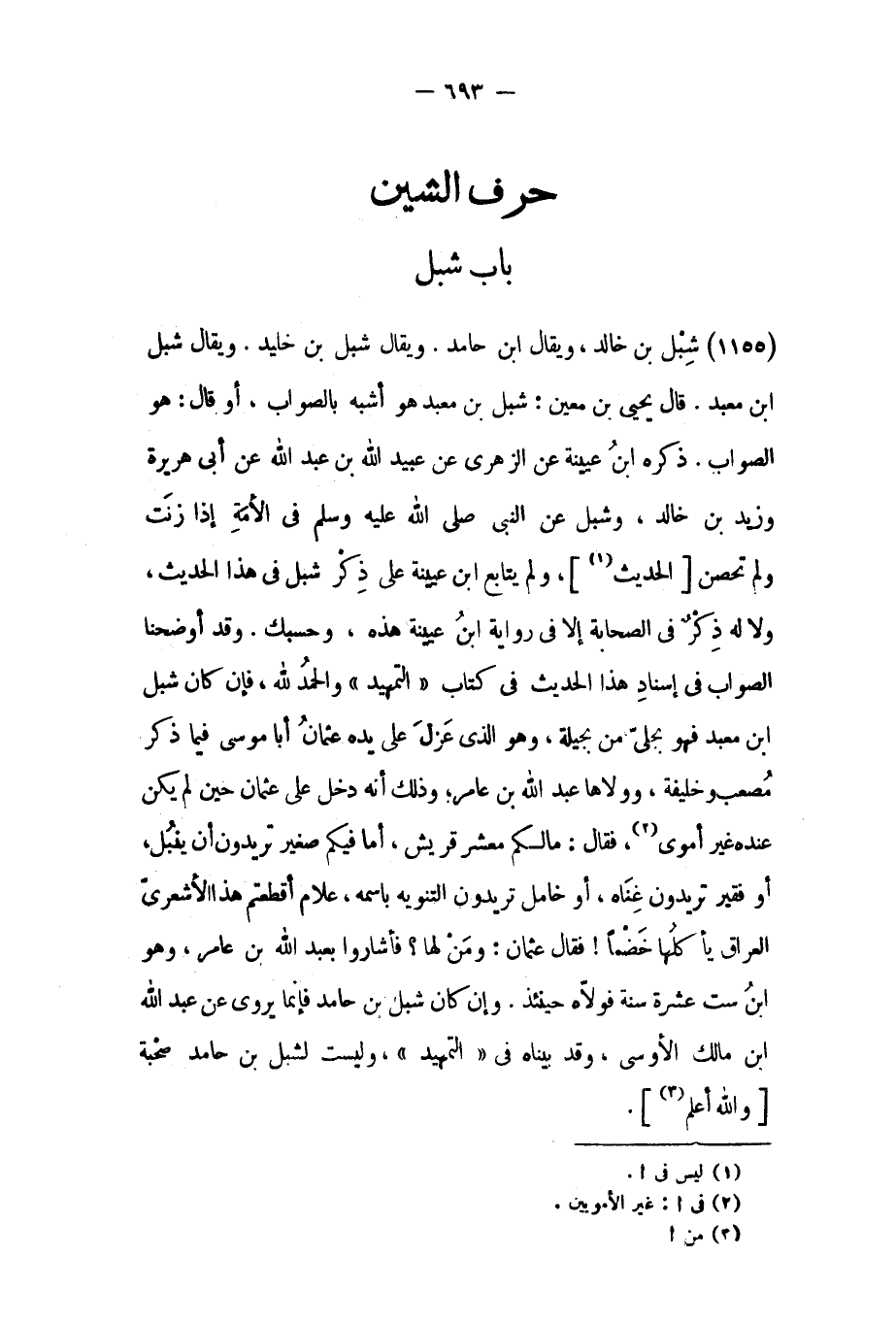 ويقَالَ ابن حامد. ويقَالَ شبل بن خليد. ويقال شبل ابن معبد. قَالَ يَحْيَى بن معين: شبل بن معبد هو أشبه بالصواب، أو قَالَ: هو الصواب. ذكره ابن عيينة عن الزهري عن عبيد الله بن عبد الله عن أبي هريرة وزيد بن خالد، وشبل عن النبي صَلَّى اللَّهُ عَلَيْهِ وَسَلَّمَ في الأمة إذا زنت ولم تحصن [الحديث [١]] ، ولم يتابع ابن عيينة على ذكر شبل في هذا الحديث، ولا له ذكر في الصحابة إلا في رواية ابن عيينة هذه، وحسبك. وقد أوضحنا الصواب في إسناد هذا الحديث في كتاب «التمهيد» والحمد للَّه، فإن كان شبل ابن معبد فهو بجلي من بجيلة، وهو الذي عزل على يده عثمان أبا موسى فيما ذكر مصعب وخليفة، وولاها عبد الله بن عامر، وذلك أنه دخل على عثمان حين لم يكن عنده غير أموي [٢] ، فَقَالَ: ما لكم معشر قريش، أما فيكم صغير تريدون أن ينبل، أو فقير تريدون غناه، أو خامل تريدون التنويه باسمه، علام أقطعتم هذا الأشعري العراق يأكلها خضما! فَقَالَ عثمان: ومن لها؟ فأشاروا بعبد الله بن عامر، وهو ابن ست عشرة سنة فولاه حينئذ. وإن كان شبل بن حامد فإنما يروي عن عبد الله ابن مالك الأوسي، وقد بيناه في «التمهيد» ، وليست لشبل بن حامد صحبة [والله أعلم [٣]] .