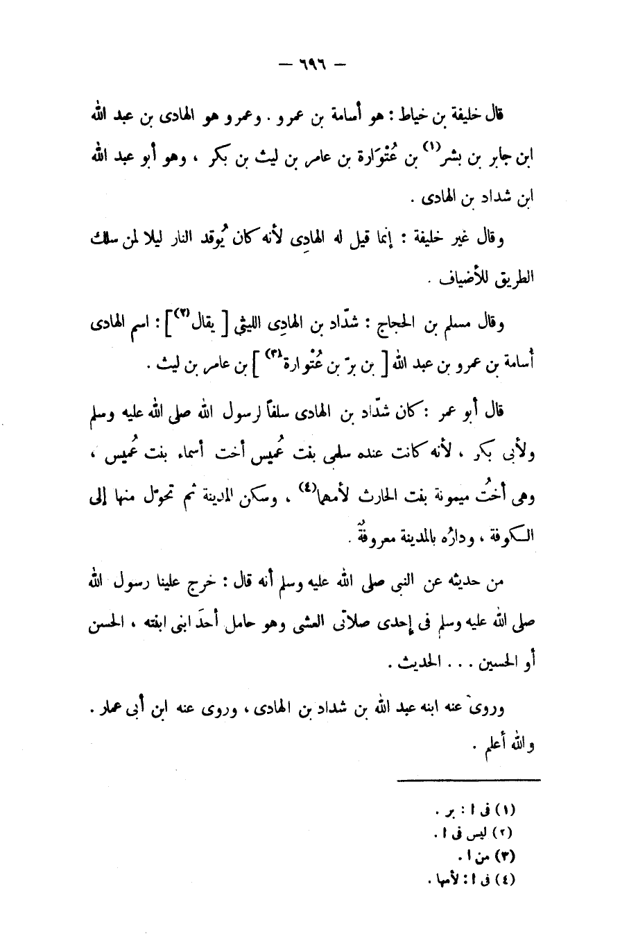 قَالَ خليفة بن خياط: هو أسامة بن عمرو. وعمرو هو الهادي بن عبد الله ابن جابر بن بشر [١] بن عتوارة بن عامر بن ليث بن بكر، وهو أبو عبد الله ابن شداد بن الهادي.