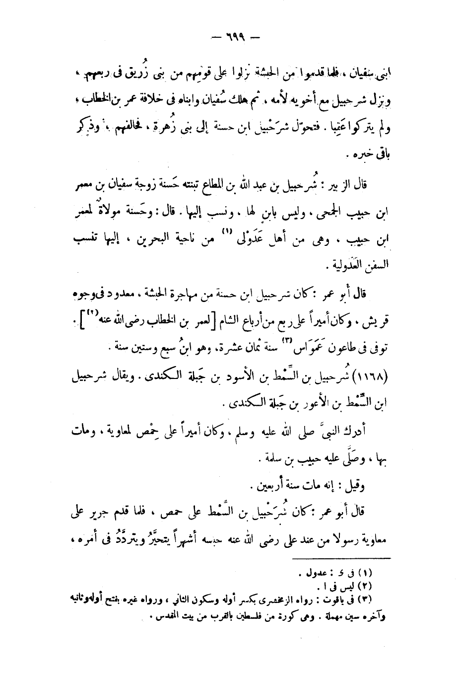 قَالَ أبو عمر: كان شرحبيل ابن حسنة من مهاجرة الحبشة، معدود في وجوه قريش، وكان أميرا على ربع من أرباع الشام [لعمر بن الخطاب رضي الله عنه [٢]] .