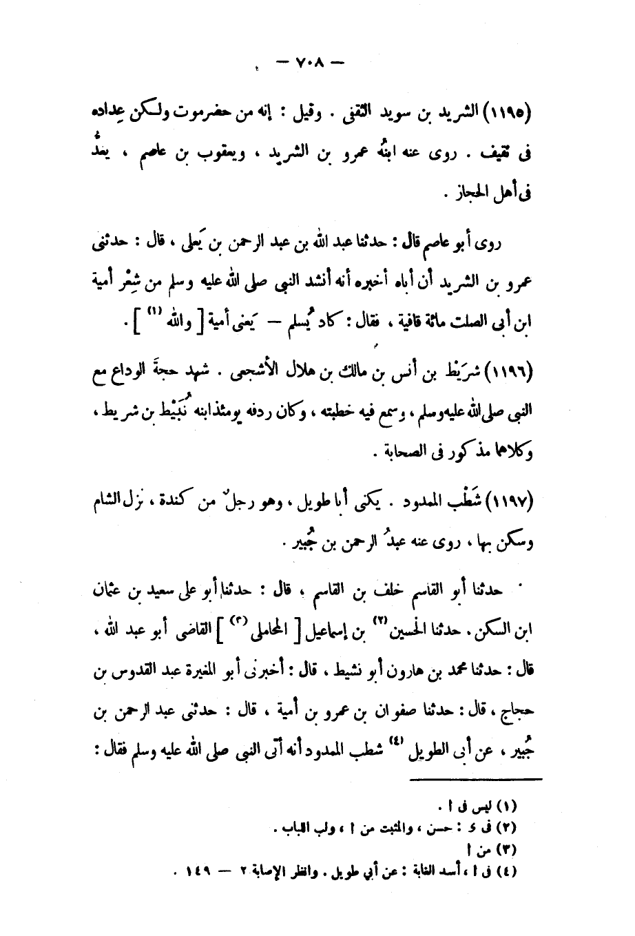 حَدَّثَنَا أَبُو القاسم خلف بن القاسم، قال: حدثنا أبو على سعيد بن عثمان ابن السَّكَنِ، حَدَّثَنَا الْحُسَيْنُ [٢] بْنُ إِسْمَاعِيلَ [الْمَحَامِلِيُّ [٣]] الْقَاضِي أَبُو عَبْدِ اللَّهِ، قَالَ: حَدَّثَنَا مُحَمَّدُ بْنُ هَارُونَ أَبُو نَشِيطٍ، قَالَ: أَخْبَرَنِي أَبُو الْمُغِيرَةِ عَبْدُ الْقُدُّوسِ بْنُ حَجَّاجٍ، قَالَ: حَدَّثَنَا صَفْوَانُ بْنُ عَمْرِو بْنِ أُمَيَّةَ، قَالَ: حَدَّثَنِي عَبْدُ الرَّحْمَنِ بْنُ جُبَيْرٍ، عَنْ أَبِي الطَّوِيلِ [٤] شَطْبٍ الْمَمْدُودِ أَنَّهُ أَتَى النَّبِيَّ صَلَّى اللَّهُ عَلَيْهِ وسلم فقال: