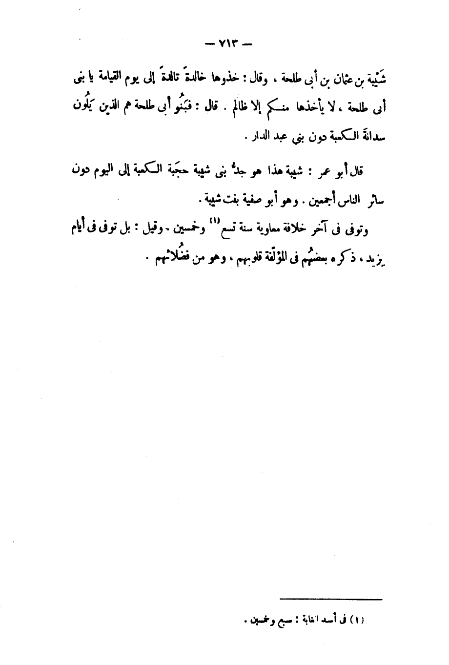شيبة بن عثمان بن أبي طلحة، وقال: خذوها خالدة تالدة إلى يوم القيامة يا بني أبي طلحة، لا يأخذها منكم إلا ظالم. قال: فبنو أبي طلحة هم الذين يلون سدانة الكعبة دون بني عبد الدار. قَالَ أبو عمر: شيبة هذا هو جد بني شيبة حجبة الكعبة إلى اليوم دون سائر الناس أجمعين. وهو أبو صفية بنت شيبة.