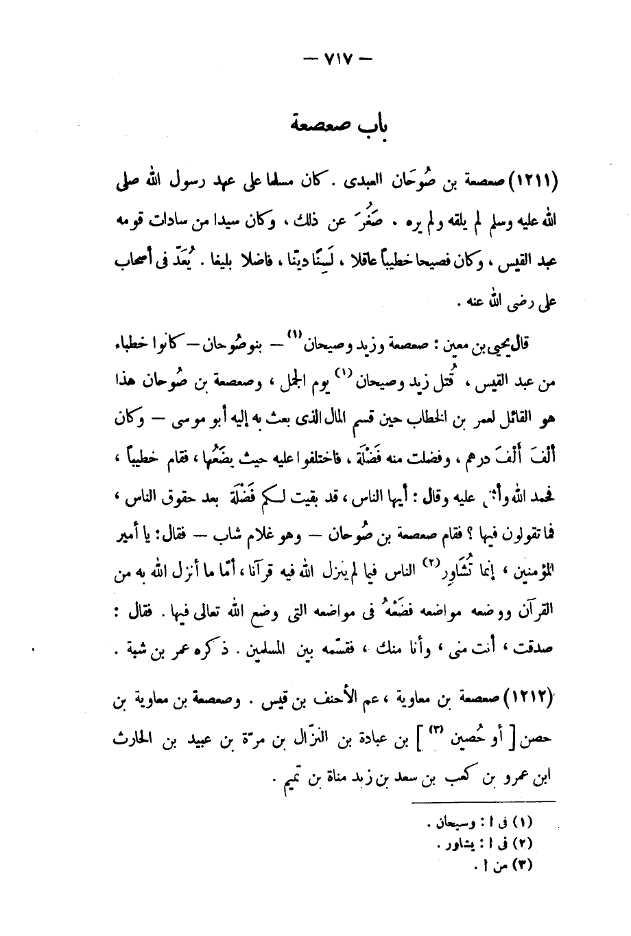 قَالَ يَحْيَى بن معين: صعصعة وزيد وصيحان [١]- بنو صوحان- كانوا خطباء من عبد القيس، قتل زيد وصيحان [١] يوم الجمل، وصعصعة بن صوحان هذا هو القائل لعمر بن الخطاب حين قسم المال الذي بعث به إليه أبو موسى- وكان ألف ألف درهم، وفضلت منه فضلة، فاختلفوا عليه حيث يضعها، فقام خطيبا، فحمد الله وأثنى عليه وَقَالَ: أيها الناس، قد بقيت لكم فضلة بعد حقوق الناس، فما تقولون فيها؟ فقام صعصعة بن صوحان- وهو غلام شاب- فَقَالَ: يا أمير المؤمنين، إنما تشاور [٢] الناس فيما لم ينزل الله فيه قرآنا، أمّا ما أنزل الله به من القرآن ووضعه مواضعه فضعه في مواضعه التي وضع الله تعالى فيها. فَقَالَ: