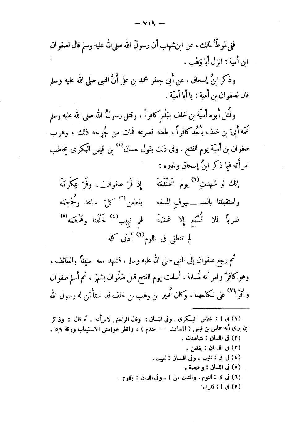 ففي الموطأ لمالك، عن ابن شهاب أن رسول الله صلى الله عليه وسلم قال لصفوان ابن أمية: انزل أبا وهب. وذكر ابن إسحاق، عن أبي جعفر محمد بن علي أن النبي صَلَّى اللَّهُ عَلَيْهِ وَسَلَّمَ قَالَ لصفوان بن أمية: يا أبا أمية. وقتل أبوه أمية بن خلف ببدر كافرا، وقتل رَسُول اللَّهِ صَلَّى اللَّهُ عَلَيْهِ وَسَلَّمَ عمه أبي بن خلف بأحد كافرا، طعنه فصرعه فمات من جرحه ذَلِكَ، وهرب صفوان بن أمية يوم الفتح. وفي ذَلِكَ يقول حسان [١] بن قيس البكري يخاطب امرأته فيما ذكر ابن إسحاق وغيره: