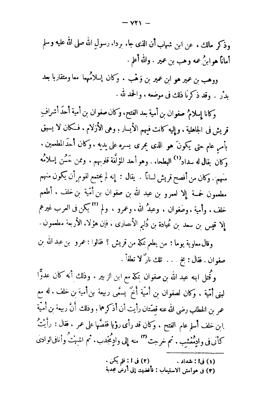 وكانا إسلام صفوان بن أمية بعد الفتح، وكان صفوان بن أمية أحد أشراف قريش في الجاهلية، وإليه كانت فيهم الأيسار، وهي الأزلام، فكان لا يسبق بأمر عام حتى يكون هو الذي يجري يسره على يديه، وكان أحد المطعمين، وكان يقَالُ له سداد [١] البطحاء. وهو أحد المؤلفة قلوبهم، وممن حسن إسلامه منهم. وكان من أفصح قريش لسانا. يقَالُ: إنه لم يجتمع لقوم أن يكون منهم مطعمون خمسة إلا لعمرو بن عبد الله بن صفوان بن أمية بن خلف، أطعم خلف، وأمية، وصفوان، وعبد الله، وعمرو، ولم [٢] يكن في العرب غيرهم إلا قيس بن سعد بن عبادة بن دليم الأنصاري، فإن هؤلاء الأربعة مطعمون.