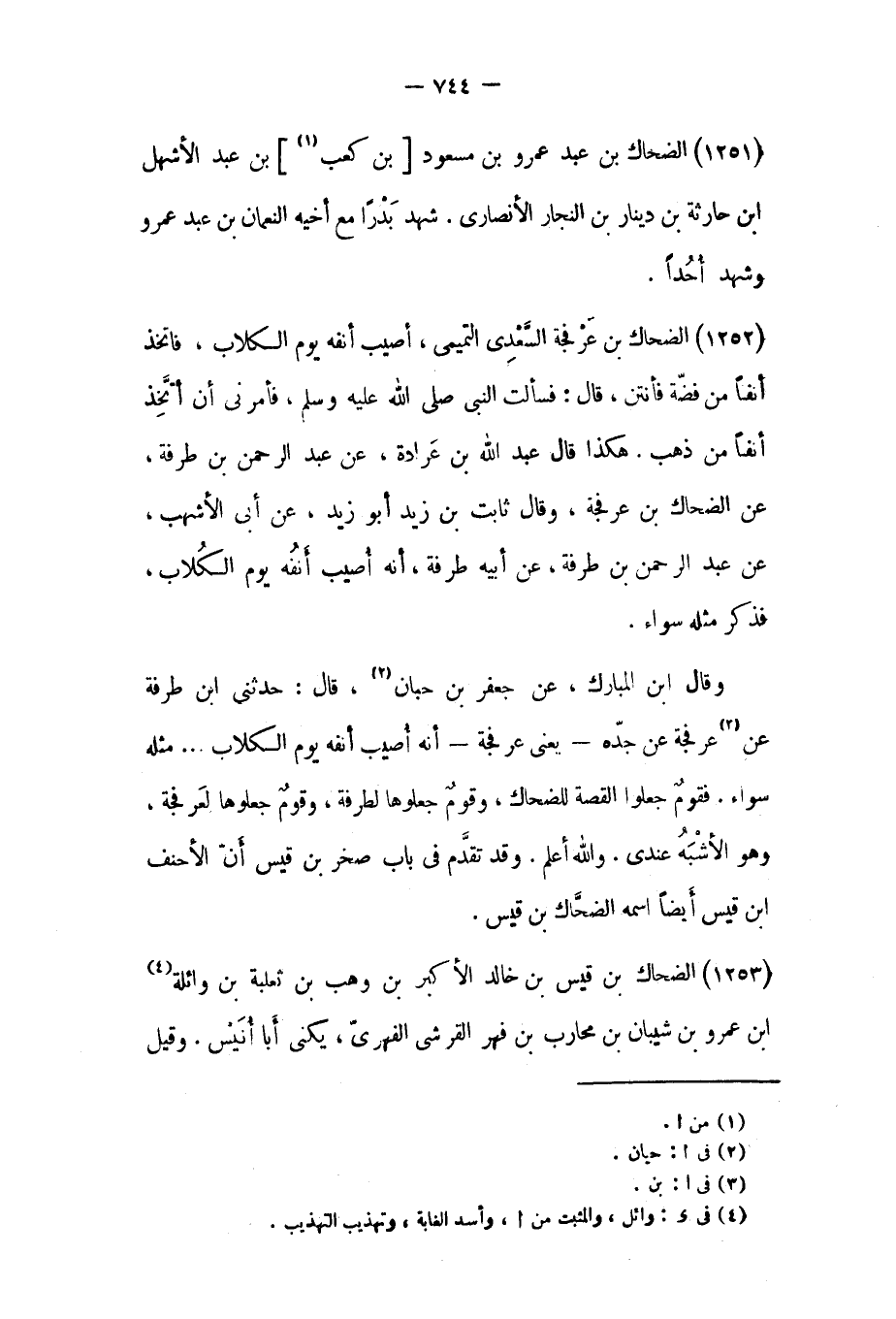 وَقَالَ ابن المبارك، عن جعفر بن حبان [٢] ، قَالَ: حَدَّثَنِي ابن طرفة عن [٣] عرفجة عَنْ جَدِّهِ- يعني عرفجة- أنه أصيب أنفه يوم الكلاب ... مثله سواء. فقوم جعلوا القصة للضحاك، وقوم جعلوها لطرفة، وقوم جعلوها لعرفجة، وهو الأشبه عندي. والله أعلم. وقد تقدم في باب صخر بن قيس أنّ الأحنف ابن قيس أيضا اسمه الضحاك بن قيس.