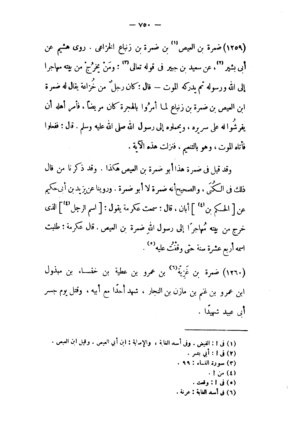 روى هشيم عن أبي بشير [٢] ، عن سعيد بن جبير في قوله تعالى [٣] : وَمن يَخْرُجْ مِنْ بَيْتِهِ مُهاجِراً إِلَى اللَّهِ وَرَسُولِهِ ثُمَّ يُدْرِكْهُ الْمَوْتُ ٤: ١٠٠- قَالَ: كان رجل من خزاعة يقَالُ له ضمرة ابن العيص بن ضمرة بن زنباع لما أمروا بالهجرة كان مريضا، فأمر أهله أن يفرشوا له على سريره، ويحملوه إِلَى رَسُولِ اللَّهِ صَلَّى اللَّهُ عَلَيْهِ وَسَلَّمَ. قَالَ: ففعلوا فأتاه الموت، وهو بالتنعيم، فنزلت هذه الآية.