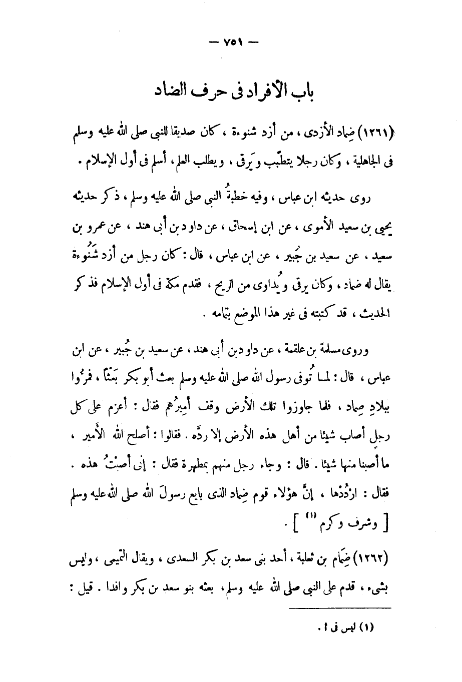 روى حديثه ابن عباس، وفيه خطبة النبي صَلَّى اللَّهُ عَلَيْهِ وَسَلَّمَ، ذكر حديثه يَحْيَى بن سعيد الأموي، عن ابن إسحاق، عن داود بن أبي هند، عن عمرو بن سعيد، عن سعيد بن جبير، عَنِ ابْنِ عَبَّاسٍ، قَالَ: كان رجل من أزد شنوءة يقَالُ له ضماد، وكان يرقى ويداوي من الريح، فقدم مكة في أول الإسلام فذكر الحديث، قد كتبته في غير هذا الموضع بتمامه.