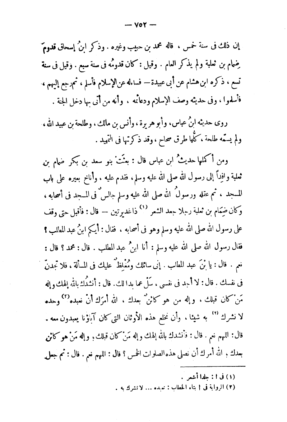 ومن أكملها حديث ابن عباس قَالَ: بعثت بنو سعد بن بكر ضمام بن ثعلبة وافدا إلى رسول الله صلى الله عليه وسلم، فقدم عليه، وأناخ بعيره على باب المسجد، ثم عقله ورسول الله صَلَّى اللَّهُ عَلَيْهِ وَسَلَّمَ جالس في المسجد في أصحابه، وكان ضمام بن ثعلبة رجلا جعد الشعر [١] ذا غديرتين- قَالَ: فأقبل حتى وقف على رَسُول اللَّهِ صَلَّى اللَّهُ عَلَيْهِ وَسَلَّمَ وهو في أصحابه، فَقَالَ: أيكم ابن عبد المطلب؟