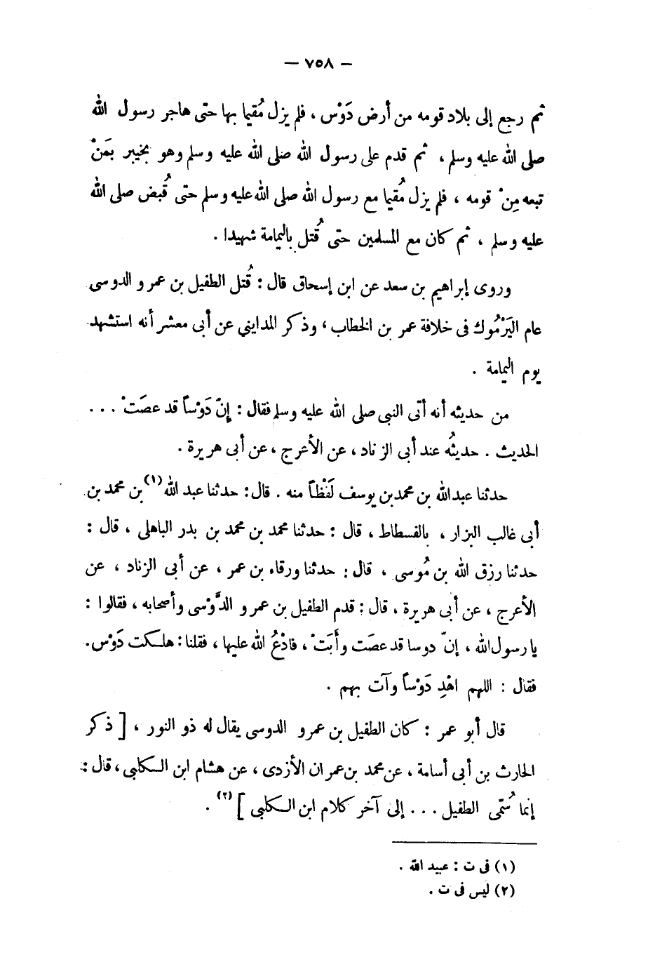 فَقَالَ: اللَّهمّ اهْدِ دَوْسًا وَآتِ بِهِمْ. قَالَ أَبُو عُمَرَ: كَانَ الطُّفَيْلُ بْنُ عَمْرٍو الدَّوْسِيُّ يُقَالَ لَهُ ذُو النُّورِ، [ذَكَرَ الْحَارِثُ بْنُ أَبِي أُسَامَةَ، عَنْ مُحَمَّدِ بْنِ عِمْرَانَ الأَزْدِيِّ، عَنْ هشام ابن الْكَلْبِيِّ، قَالَ: