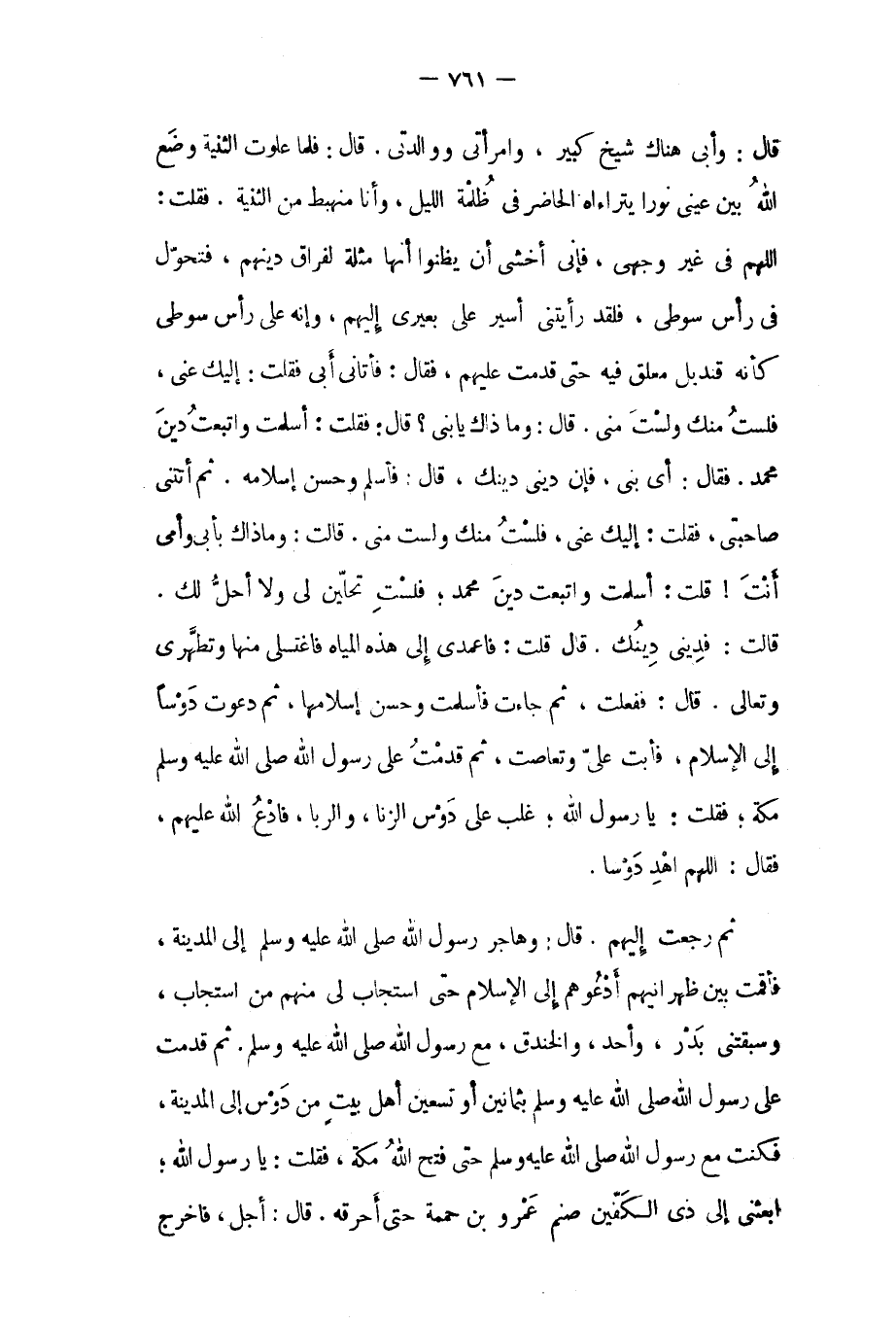 قالت: فديني دينك. قَالَ قلت: فاعمدي إلى هذه المياه فاغتسلي منها وتطهري وتعالي. قَالَ: ففعلت، ثم جاءت فأسلمت وحسن إسلامها، ثم دعوت دوسا إلى الإسلام، فأبت علي وتعاصت، ثم قدمت على رَسُول اللَّهِ صَلَّى اللَّهُ عَلَيْهِ وَسَلَّمَ مكة، فقلت: يَا رَسُولَ اللَّهِ، غلب على دوس الزنا، والربا، فادع الله عليهم، فَقَالَ: اللَّهمّ اهد دوسا. ثم رجعت إليهم. قَالَ: وهاجر رَسُول اللَّهِ صَلَّى اللَّهُ عَلَيْهِ وَسَلَّمَ إلى المدينة، فأقمت بين ظهرانيهم أدعوهم إلى الإسلام حتى استجاب لي منهم من استجاب، وسبقتني بدر، وأحد، والخندق، مع رَسُول اللَّهِ صَلَّى اللَّهُ عَلَيْهِ وَسَلَّمَ. ثم قدمت على رَسُول اللَّهِ صَلَّى اللَّهُ عَلَيْهِ وَسَلَّمَ بثمانين أو تسعين أهل بيت من دوس إلى المدينة، فكنت مع رسول الله صلى الله عليه وسلم حتى فتح الله مكة، فقلت: يا رَسُول اللَّهِ، ابعثني إلى ذي الكفين صنم عمرو بن حممة حتى أحرقه. قال: أجل، فاخرج