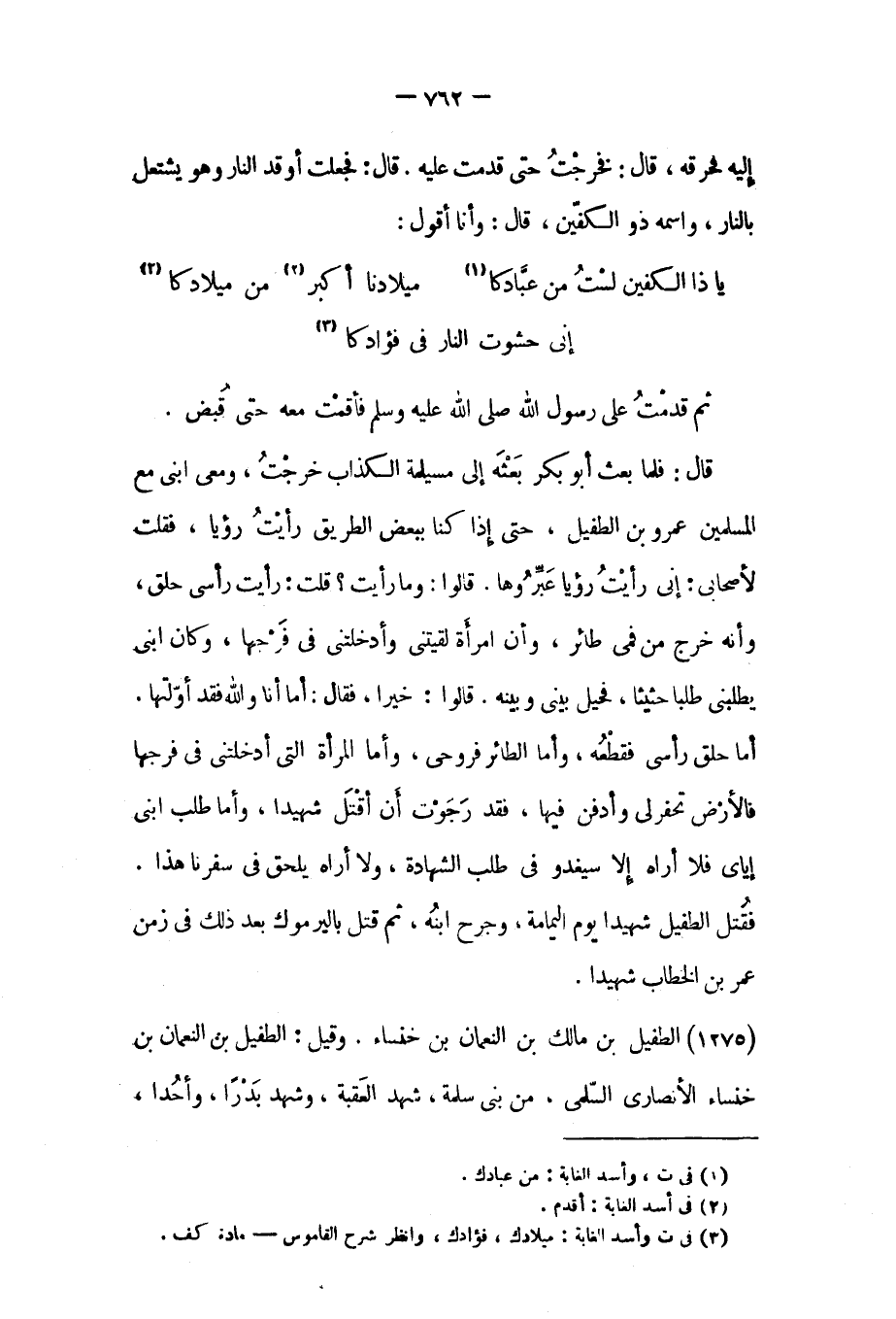 قَالَ: فلما بعث أبو بكر بعثه إلى مسيلمة الكذاب خرجت، ومعي ابني مع المسلمين عمرو بن الطفيل، حتى إذا كنا ببعض الطريق رأيت رؤيا، فقلت لأصحابي: إني رأيت رؤيا عبروها. قالوا: وما رأيت؟ قلت: رأيت رأسي حلق، وأنه خرج من فمي طائر، وأن امرأة لقيتني وأدخلتني في فرجها، وكان ابني يطلبني طلبا حثيثا، فحيل بيني وبينه. قالوا: خيرا، فَقَالَ: أما أنا والله فقد أولتها.