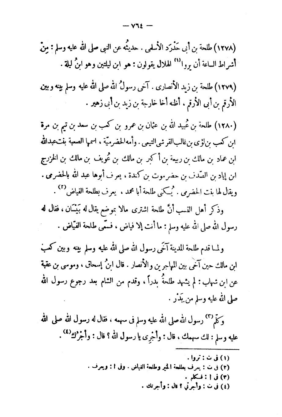 (١٢٨٠) طلحة بن عبيد الله بن عثمان بن عمرو بن كعب بن سعد بن تيم بن مرة ابن كعب بن لؤي بن غالب القرشي التيمي.