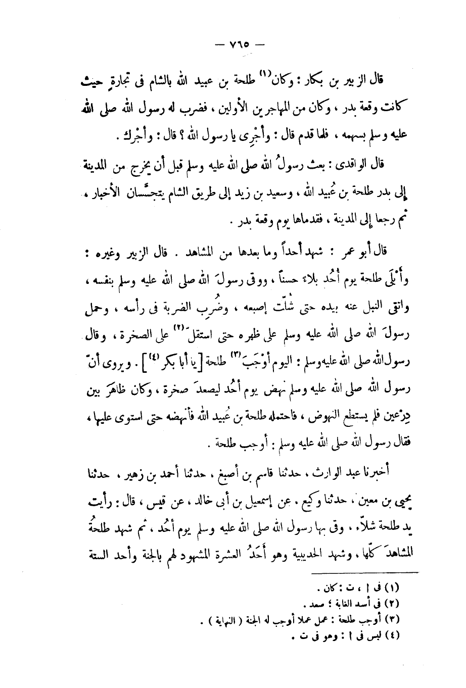 وأبلى طلحة يوم أحد بلاء حسنا، ووقى رَسُول اللَّهِ صَلَّى اللَّهُ عَلَيْهِ وَسَلَّمَ بنفسه، واتقى النبل عنه بيده حتى شلت إصبعه، وضرب الضربة في رأسه، وحمل رسول الله صلى الله عليه وسلم على ظهره حتى استقل [٢] على الصخرة، وَقَالَ رَسُولُ اللَّهِ صَلَّى اللَّهُ عَلَيْهِ وَسَلَّمَ: اليوم أوجب [٣] طلحة [يا أبا بكر [٤]] . ويروى أن رَسُول اللَّهِ صَلَّى اللَّهُ عَلَيْهِ وَسَلَّمَ نهض يوم أحد ليصعد صخرة، وكان ظاهر بين درعين فلم يستطع النهوض، فاحتمله طلحة بن عبيد الله فأنهضه حتى استوى عليها، فَقَالَ رَسُولُ اللَّهِ صَلَّى اللَّهُ عَلَيْهِ وَسَلَّمَ: أوجب طلحة. أَخْبَرَنَا عَبْدُ الْوَارِثِ، حَدَّثَنَا قَاسِمُ بْنُ أَصْبَغَ، حَدَّثَنَا أَحْمَدُ بْنُ زُهَيْرٍ، حَدَّثَنَا يَحْيَى بْنُ مَعِينٍ، حَدَّثَنَا وَكِيعٌ، عَنْ إِسْمَاعِيلَ بْنِ أَبِي خَالِدٍ، عَنْ قَيْسٍ، قَالَ: رَأَيْتُ يَدَ طَلْحَةَ شَلاءَ، وَقَى بِهَا رَسُولَ اللَّهِ صَلَّى اللَّهُ عَلَيْهِ وَسَلَّمَ يَوْمَ أُحُدٍ، ثُمَّ شَهِدَ طَلْحَةُ الْمَشَاهِدَ كُلَّهَا، وَشَهِدَ الْحُدَيْبِيَةَ وَهُوَ أَحَدُ الْعَشْرَةِ المشهود لهم بالجنة وأحد الستة