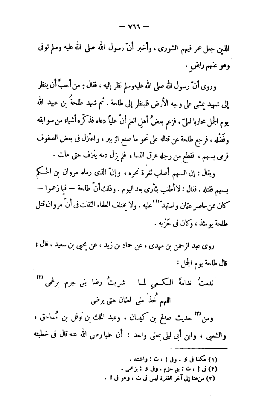 وَرُوِيَ أَنَّ رَسُول اللَّهِ صَلَّى اللَّهُ عَلَيْهِ وَسَلَّمَ نَظَرَ إِلَيْهِ، فَقَالَ: مَنْ أَحَبَّ أَنْ يَنْظُرَ إِلَى شَهِيدٍ يَمْشِي عَلَى وَجْهِ الأَرْضِ فَلْيَنْظُرْ إِلَى طَلْحَةَ. ثُمَّ شَهِدَ طَلْحَةُ بْنُ عُبَيْدِ اللَّهِ يَوْمَ الْجَمَلِ مُحَارِبًا لِعَلِيٍّ، فَزَعَمَ بَعْضُ أَهْلِ الْعِلْمِ أَنَّ عَلِيًّا دَعَاهُ فَذَكَّرَهُ أَشْيَاءَ مِنْ سَوَابِقِهِ وَفَضْلِهِ، فَرَجَعَ طَلْحَةُ عَنْ قِتَالِهِ عَلَى نَحْوِ مَا صَنَعَ الزُّبَيْرِ، وَاعْتَزَلَ فِي بَعْضِ الصُّفُوفِ فَرُمِيَ بِسَهْمٍ، فَقَطَعَ مِنْ رِجْلِهِ عِرْقَ النَّسَا، فَلَمْ يَزَلْ دَمُهُ يَنْزِفُ حَتَّى مَاتَ.