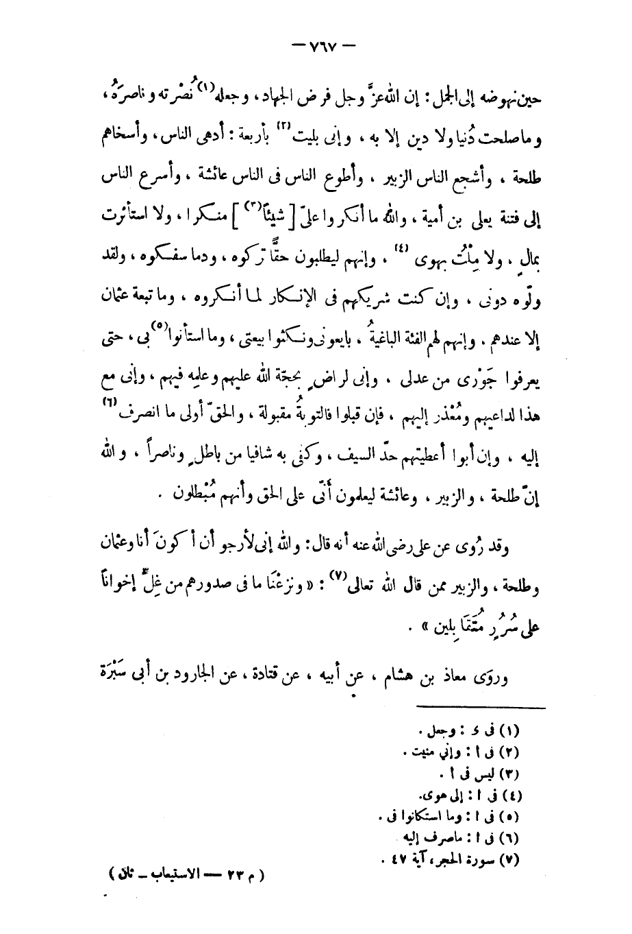 حين نهوضه إلى الجمل: إن الله عز وجل فرض الجهاد، وجعله [١] نصرته وناصره، وما صلحت دنيا ولا دين إلا به، وإني بليت [٢] بأربعة: أدهى الناس، وأسخاهم طلحة، وأشجع الناس الزبير، وأطوع الناس في الناس عائشة، وأسرع الناس إلى فتنة يعلى بن أمية، والله ما أنكروا علي [شيئا [٣]] منكرا، ولا استأثرت بمال، ولا ملت بهوى [٤] ، وإنهم ليطلبون حقا تركوه، ودما سفكوه، ولقد ولوه دوني، وإن كنت شريكهم في الإنكار لما أنكروه، وما تبعة عثمان إلا عندهم، وإنهم لهم الفئة الباغية، بايعوني ونكثوا بيعتي، وما استأنوا [٥] بي، حتى يعرفوا جوري من عدلي، وإني لراض بحجة الله عليهم وعلمه فيهم، وإني مع هذا لداعيهم ومعذر إليهم، فإن قبلوا فالتوبة مقبولة، والحق أولى ما انصرف [٦] إليه، وإن أبوا أعطيتهم حد السيف، وكفى به شافيا من باطل وناصرا، والله إن طلحة، والزبير، وعائشة ليعلمون أني على الحق وأنهم مبطلون. وقد روي عن علي رضي الله عنه أنه قَالَ: والله إني لأرجو أن أكون أنا وعثمان وطلحة، والزبير ممن قَالَ الله تعالى [٧] : «وَنَزَعْنا مَا فِي صُدُورِهِمْ مِنْ غِلٍّ إِخْواناً عَلى سُرُرٍ مُتَقابِلِينَ» ١٥: ٤٧. وروى معاذ بن هشام، عَنْ أَبِيهِ، عَنْ قتادة، عن الجارود بن أبى سبرة