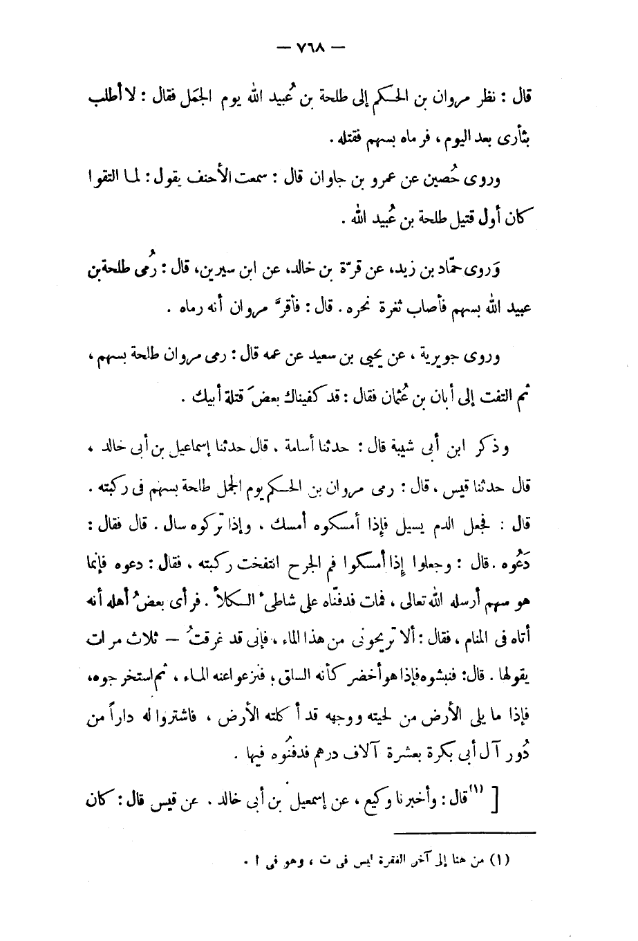 وروى حماد بن زيد، عن قرة بن خالد، عن ابن سيرين، قَالَ: رمي طلحة بن عبيد الله بسهم فأصاب ثغرة نحره. قَالَ: فأقر مروان أنه رماه.
