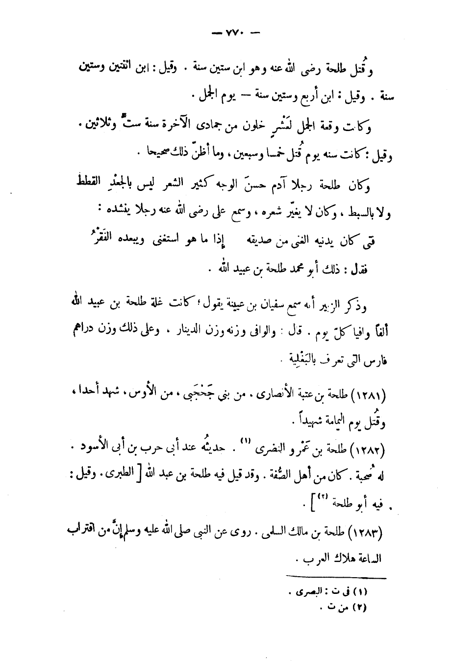 وقتل طلحة رضي الله عنه وهو ابن ستين سنة. وقيل: ابن اثنتين وستين سنة. وقيل: ابن أربع وستين سنة- يوم الجمل.