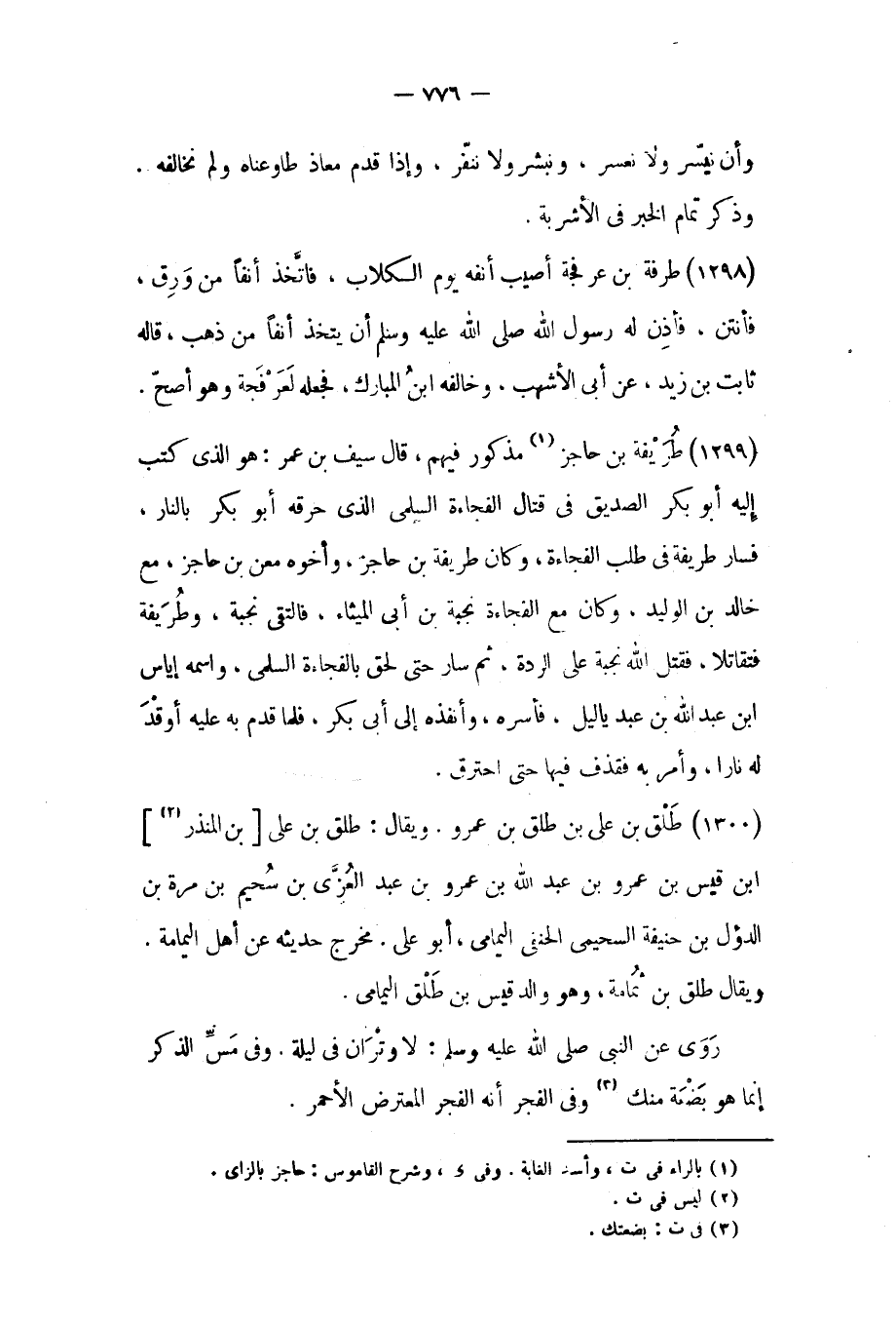 مذكور فيهم، قَالَ سيف بن عمر: هو الذي كتب إليه أبو بكر الصديق في قتال الفجاءة السلمي الذي حرقه أبو بكر بالنار، فسار طريفة في طلب الفجاءة، وكان طريفة بن حاجز، وأخوه معن بن حاجز، مع خالد بن الوليد، وكان مع الفجاءة نجبة بن أبي الميثاء، فالتقى نجبة، وطريفة فتقاتلا، فقتل الله نجبة على الردة، ثم سار حتى لحق بالفجاءة السلمي، واسمه إياس ابن عبد الله بن عبد ياليل، فأسره، وأنفذه إلى أبي بكر، فلما قدم به عليه أوقد له نارا، وأمر به فقذف فيها حتى احترق.