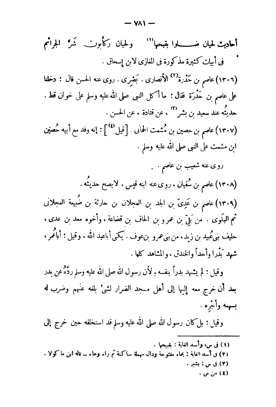 (١٣٠٩) عاصم بن عدي بن الجد بن العجلان بن حارثة بن ضبيعة العجلاني ثم البلوي.