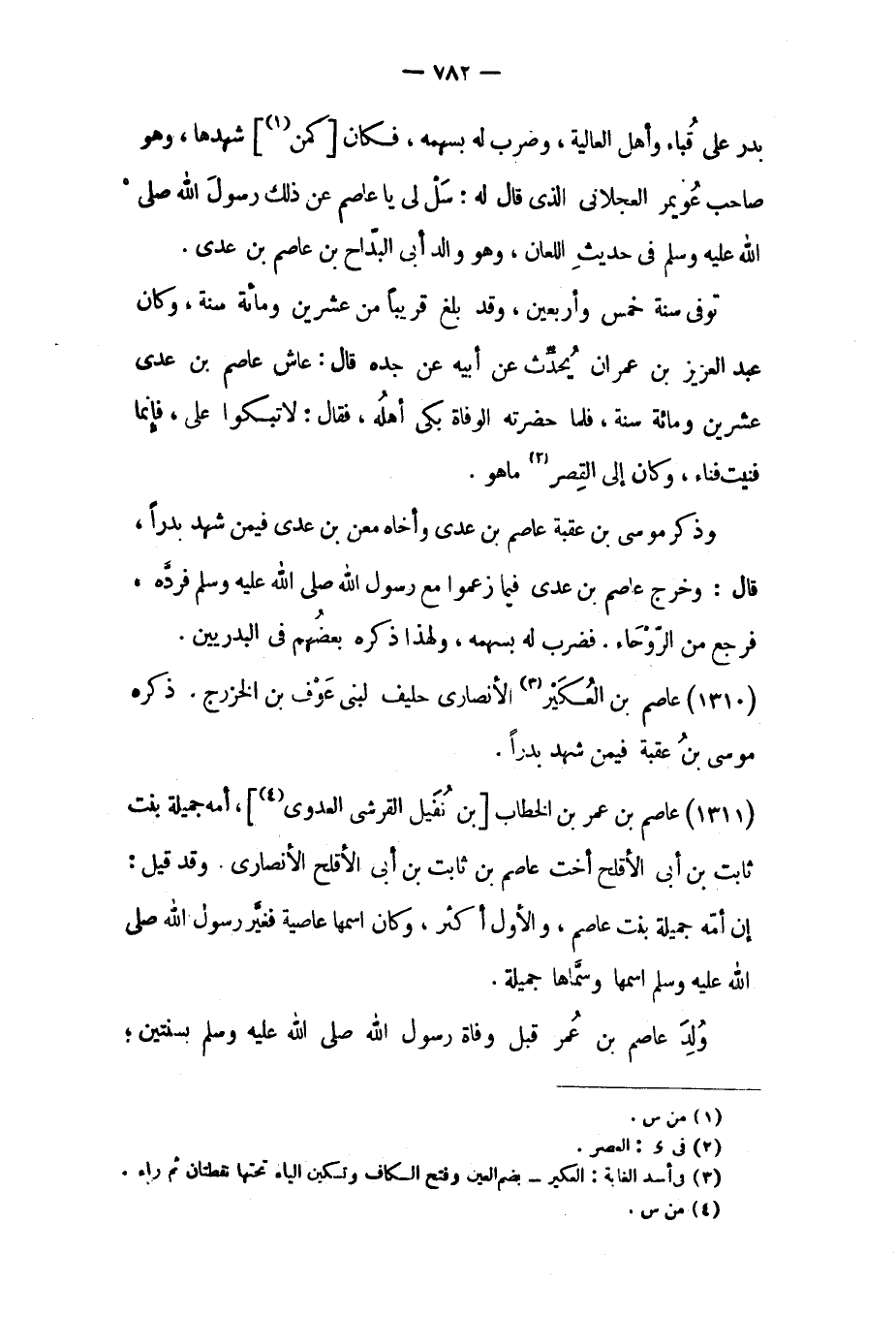 (١٣١١) عاصم بن عمر بن الخطاب [بن نفيل القرشي العدوي [٤]] ، أمه جميلة بنت ثابت بن أبي الأقلح أخت عاصم بن ثابت بن أبي الأقلح الأنصاري.