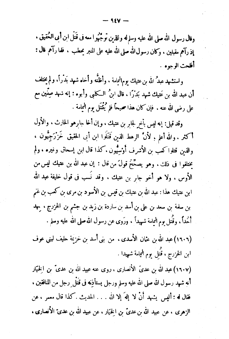أفلحت الوجوه. واستشهد عَبْد اللَّهِ بْن عَتِيك يَوْم اليمامة، وأظنه وأخاه شهد بدرا، ولم يختلف أن عَبْد اللَّهِ بْن عَتِيك شهد بدرا، قَالَ ابْن الكلبي وأبوه: إنه شهد صفين مع علي رَضِيَ اللَّهُ عَنْهُ، فإن كَانَ هَذَا صحيحا فلم يقتل يَوْم اليمامة.