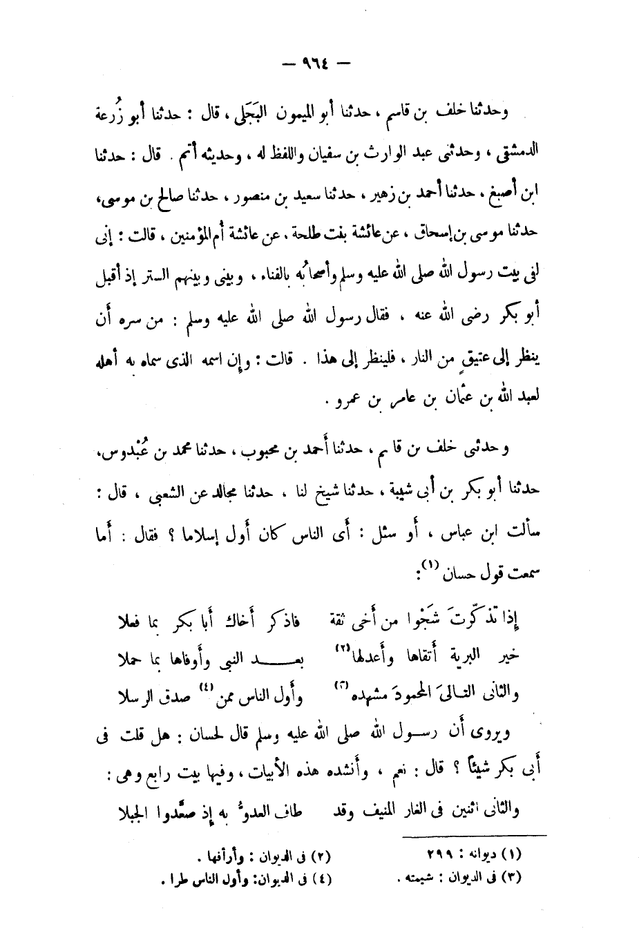 ويروى أن رَسُول اللَّهِ صَلَّى اللَّهُ عَلَيْهِ وَسَلَّمَ قَالَ لحسان: هل قلت فِي أَبِي بكرٍ شيئا؟ قَالَ: نعم، وأنشده هذه الأبيات، وفيها بيت رابع وهي: