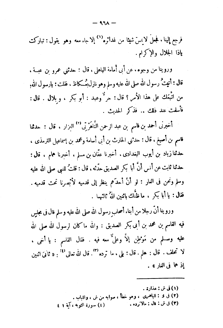 وروينا من وجوه، عَنْ أَبِي أمامة الباهلي، قَالَ: حَدَّثَنِي عَمْرو بْن عبسة، قَالَ: أتيت رَسُول اللَّهِ صَلَّى اللَّهُ عَلَيْهِ وَسَلَّمَ وَهُوَ نازل بعكاظ، فقلت: يَا رَسُول اللَّهِ، من اتبعك على هَذَا الأمر؟ قَالَ: حر وعبد: أَبُو بكرٍ، وبلال. قَالَ: