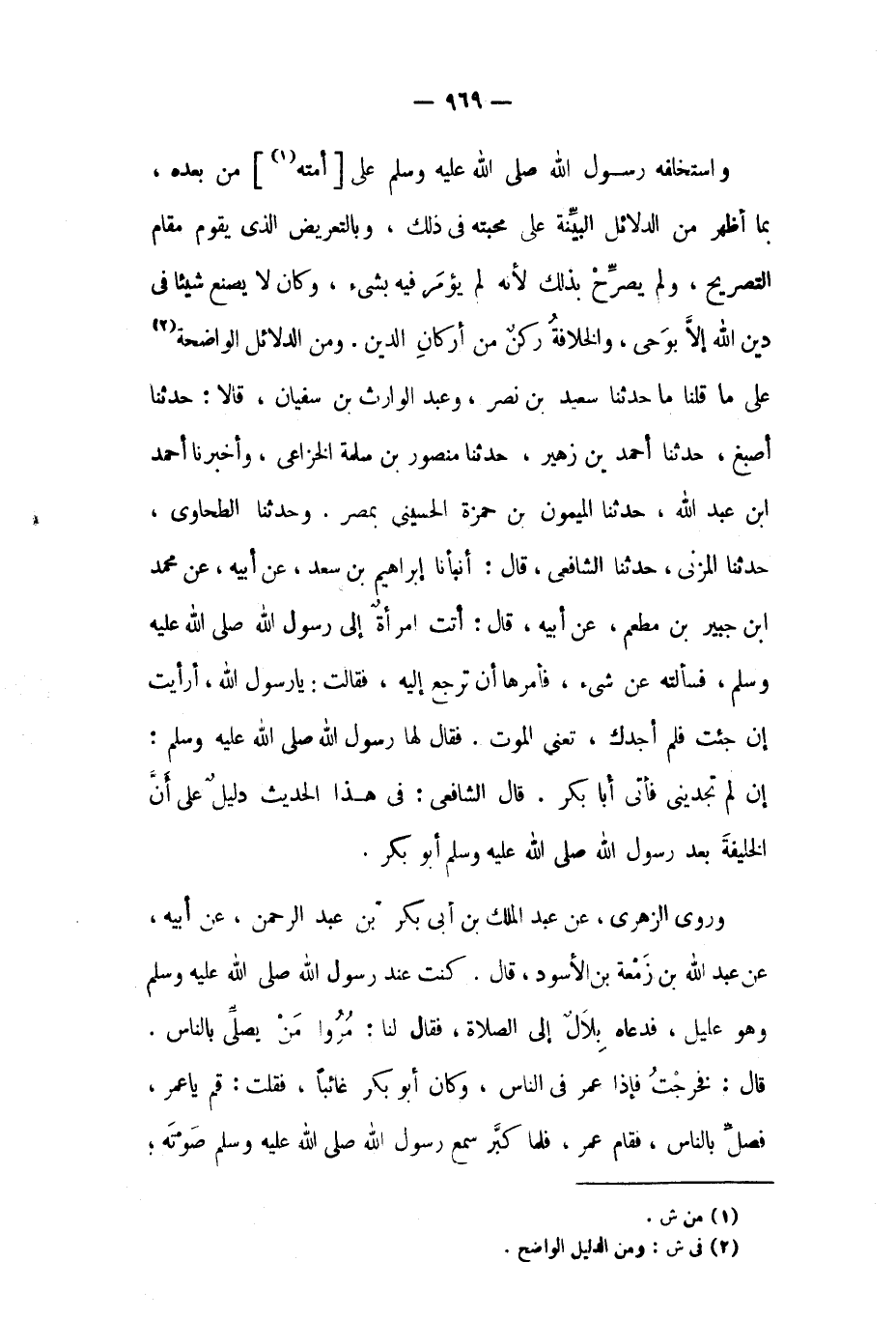 واستخلفه رَسُول اللَّهِ صَلَّى اللَّهُ عَلَيْهِ وَسَلَّمَ على [أمته [١]] من بعده، بما أظهر من الدلائل البينة على محبته فِي ذَلِكَ، وبالتعريض الَّذِي يقوم مقام التصريح، ولم يصرح بذلك لأنه لم يؤمر فِيهِ بشيء، وَكَانَ لا يصنع شيئا فِي دين الله إلا بوحي، والخلافة ركن من أركان الدين. وَمِنَ الدَّلائِلِ الْوَاضِحَةِ [٢] عَلَى مَا قُلْنَا مَا حَدَّثَنَا سَعِيدُ بْنُ نَصْرٍ، وَعَبْدُ الْوَارِثِ بْنُ سُفْيَانَ، قَالا: حدثنا أَصْبَغَ، حَدَّثَنَا أَحْمَدُ بْنُ زُهَيْرٍ، حَدَّثَنَا مَنْصُورُ بن سلمة الخزاعي، وأخبرنا أحمد ابن عَبْدِ اللَّهِ، حَدَّثَنَا الْمَيْمُونُ بْنُ حَمْزَةَ الْحُسَيْنِيُّ بِمِصْرَ. وَحَدَّثَنَا الطَّحَاوِيُّ، حَدَّثَنَا الْمُزْنِيُّ، حَدَّثَنَا الشَّافِعِيُّ، قَالَ: أَنْبَأَنَا إِبْرَاهِيمُ بْنُ سَعْدٍ، عَنْ أَبِيهِ، عن محمد ابن جُبَيْرِ بْنِ مُطْعَمٍ، عَنْ أَبِيهِ، قَالَ: أَتَتِ امْرَأَةٌ إِلَى رَسُولِ اللَّهِ صَلَّى اللَّهُ عَلَيْهِ وَسَلَّمَ، فَسَأَلَتْهُ عَنْ شَيْءٍ، فَأَمَرَهَا أَنْ تَرْجِعَ إِلَيْهِ، فَقَالَتْ: يَا رَسُولَ اللَّهِ، أَرَأَيْتَ إِنْ جِئْتُ فَلَمْ أَجِدْكَ، تَعْنِي الْمَوْتَ. فَقَالَ لَهَا رسول الله صلى الله عليه وسلم: