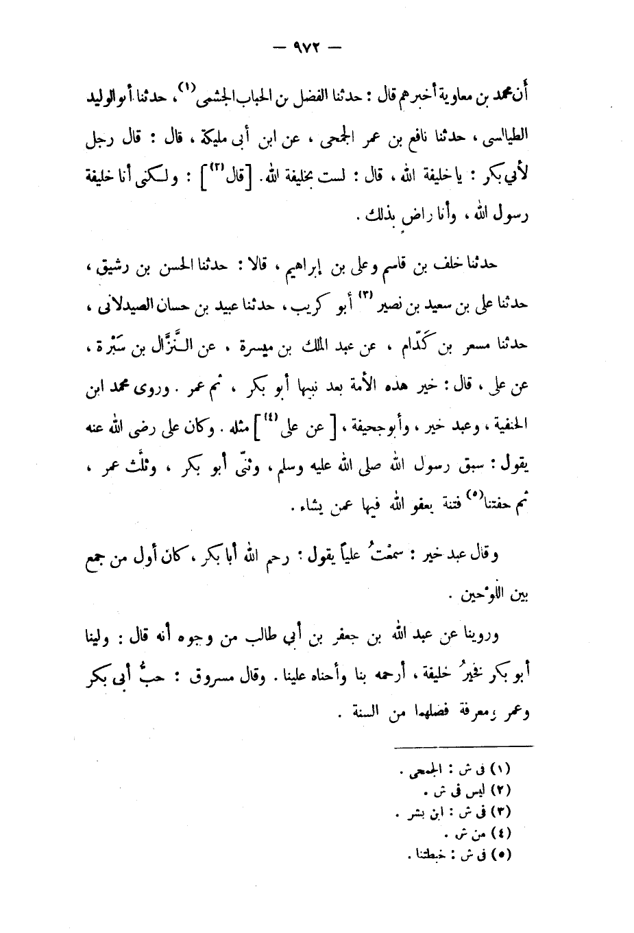 حَدَّثَنَا خَلَفُ بْنُ قَاسِمٍ وعلى بْنُ إِبْرَاهِيمَ، قَالَ: حَدَّثَنَا الْحَسَنُ بْنُ رَشِيقٍ، حَدَّثَنَا عَلِيُّ بْنُ سَعِيدِ بْنِ نُصَيْرٍ [٣] أَبُو كُرَيْبٍ، حَدَّثَنَا عُبَيْدُ بْنُ حَسَّانٍ الصَّيْدَلانِيُّ، حَدَّثَنَا مِسْعَرُ بْنُ كِدَامٍ، عَنْ عَبْدِ الْمَلِكِ بْنِ مَيْسَرَةَ، عَنِ النَّزَّالِ بْنِ سَبْرَةَ، عَنْ عَلِيٍّ، قَالَ: خَيْرُ هَذِهِ الأُمَّةِ بَعْدَ نَبِيِّهَا أَبُو بَكْرٍ، ثُمَّ عُمَرُ. وَرَوَى مُحَمَّد ابْن الحنفية، وعبد خير، وَأَبُو جحيفة، [عَنْ علي [٤]] مثله. وكان علي رَضِيَ اللَّهُ عَنْهُ يَقُول: سبق رَسُول اللَّهِ صَلَّى اللَّهُ عَلَيْهِ وَسَلَّمَ، وثنى أَبُو بَكْر، وثلث عُمَر، ثُمَّ حفتنا [٥] فتنة يعفو الله فيها عمن يشاء. وقال عبد خير: سمعت عليا يَقُول: رحم الله أَبَا بَكْر، كَانَ أول من جمع بين اللوحين. وروينا عَنْ عَبْد اللَّهِ بْن جَعْفَر بْن أَبِي طالب من وجوه أَنَّهُ قَالَ: ولينا أَبُو بَكْر فخير خليفة، أرحمه بنا وأحناه علينا. وقال مسروق: حب أَبِي بَكْر وَعُمَر ومعرفة فضلهما من السنة.